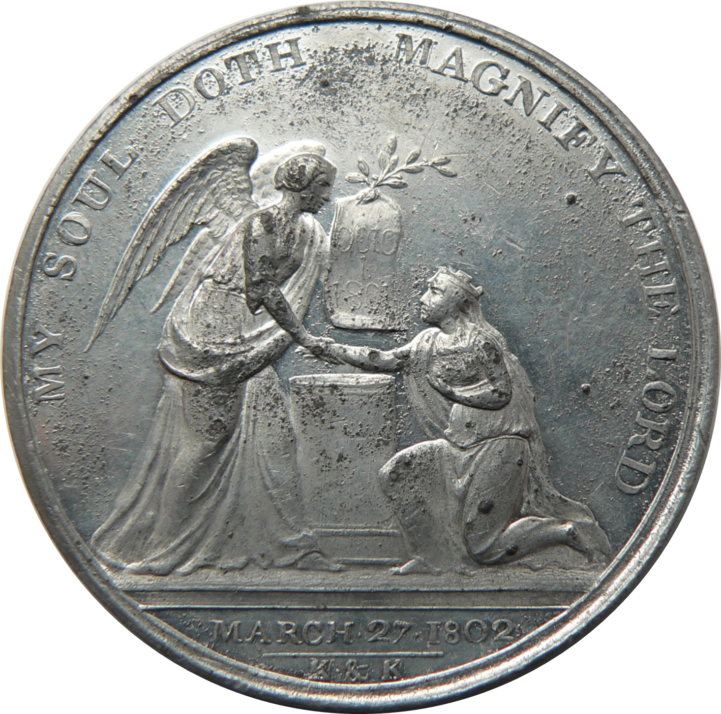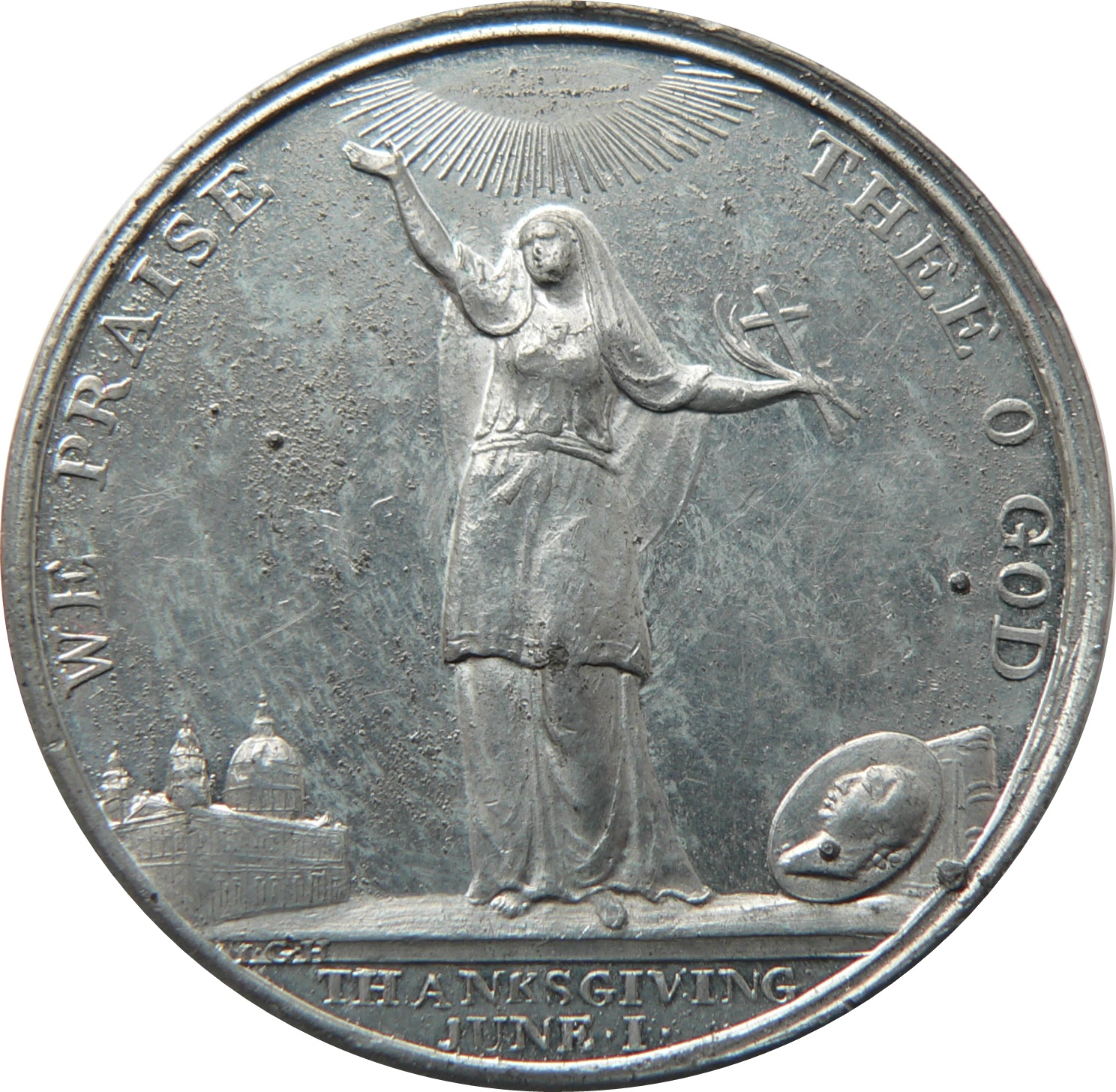 Опис: У центрі зображена фігура Релігії в драпірованому вбранні, з хрестом і пальмою в лівій руці, піднятою в знак похвали правою рукою, над нею сяє сонце. Внизу ліворуч — собор Святого Павла, внизу праворуч — щит із зображенням короля Георга III. Напис навколо та в екзергу.