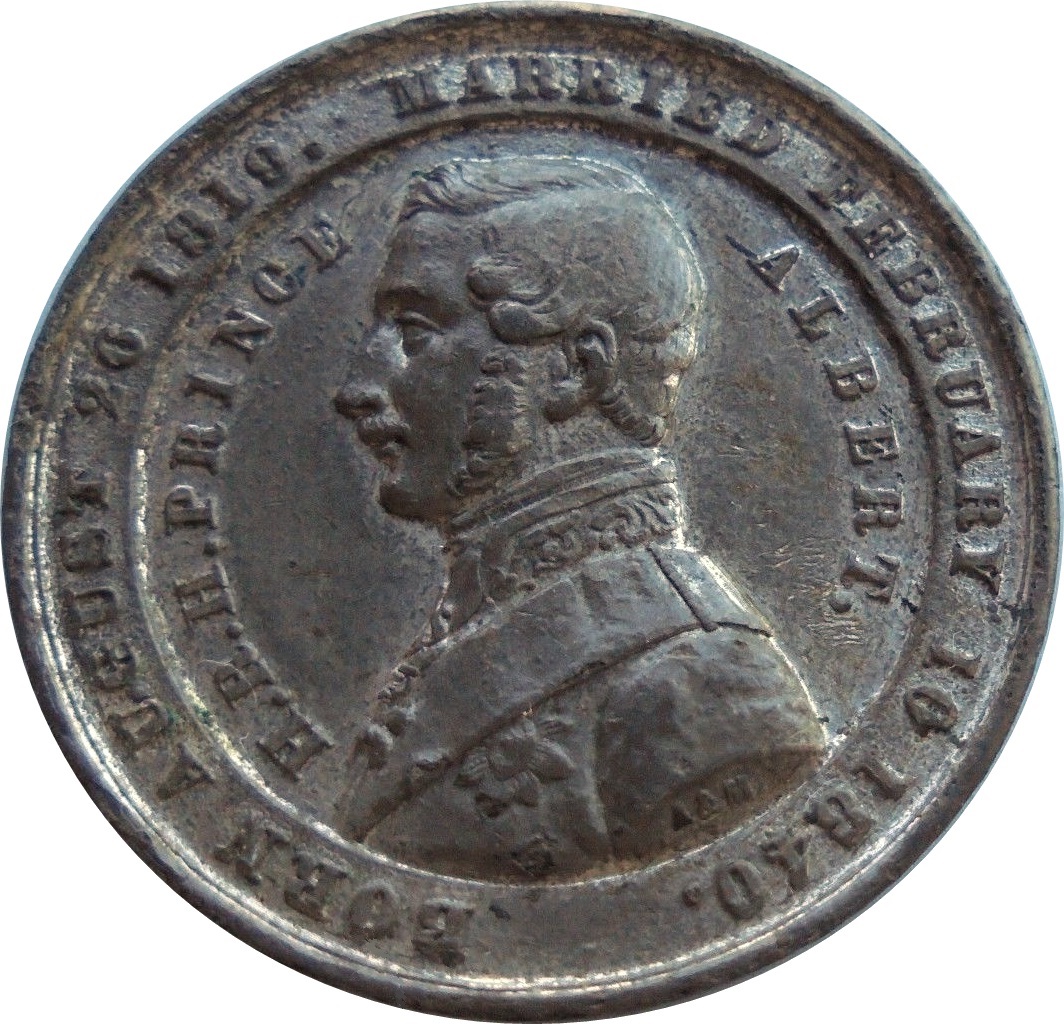 Опис: Внутрішнє коло містить бюст принца Альберта ліворуч, в уніформі та з орденом. Напис всередині та зовні кола.