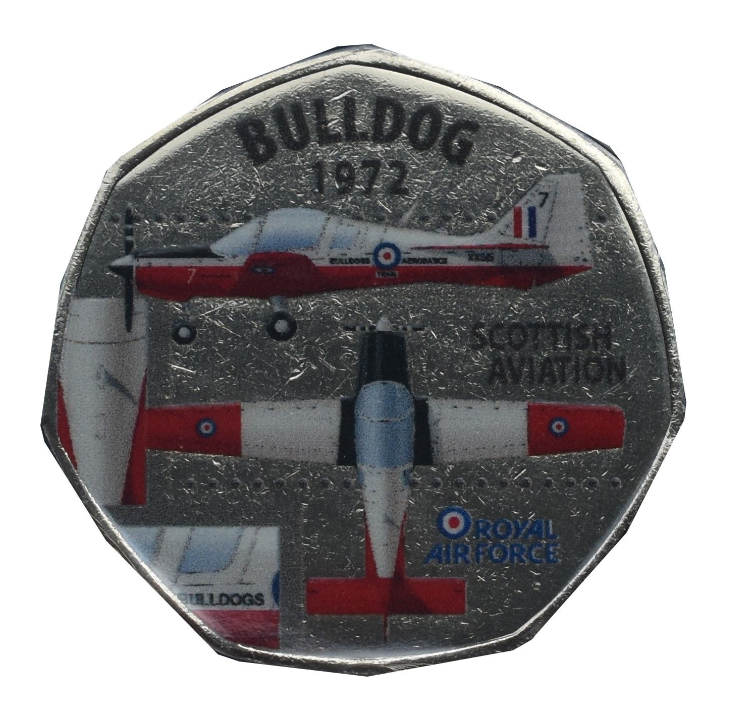 Опис: Вигляд збоку та зверху шотландської авіаційної монети «Бульдог» 1972 року з емблемою Королівських повітряних сил (RAF Roundel ROYAL AIR FORCE).