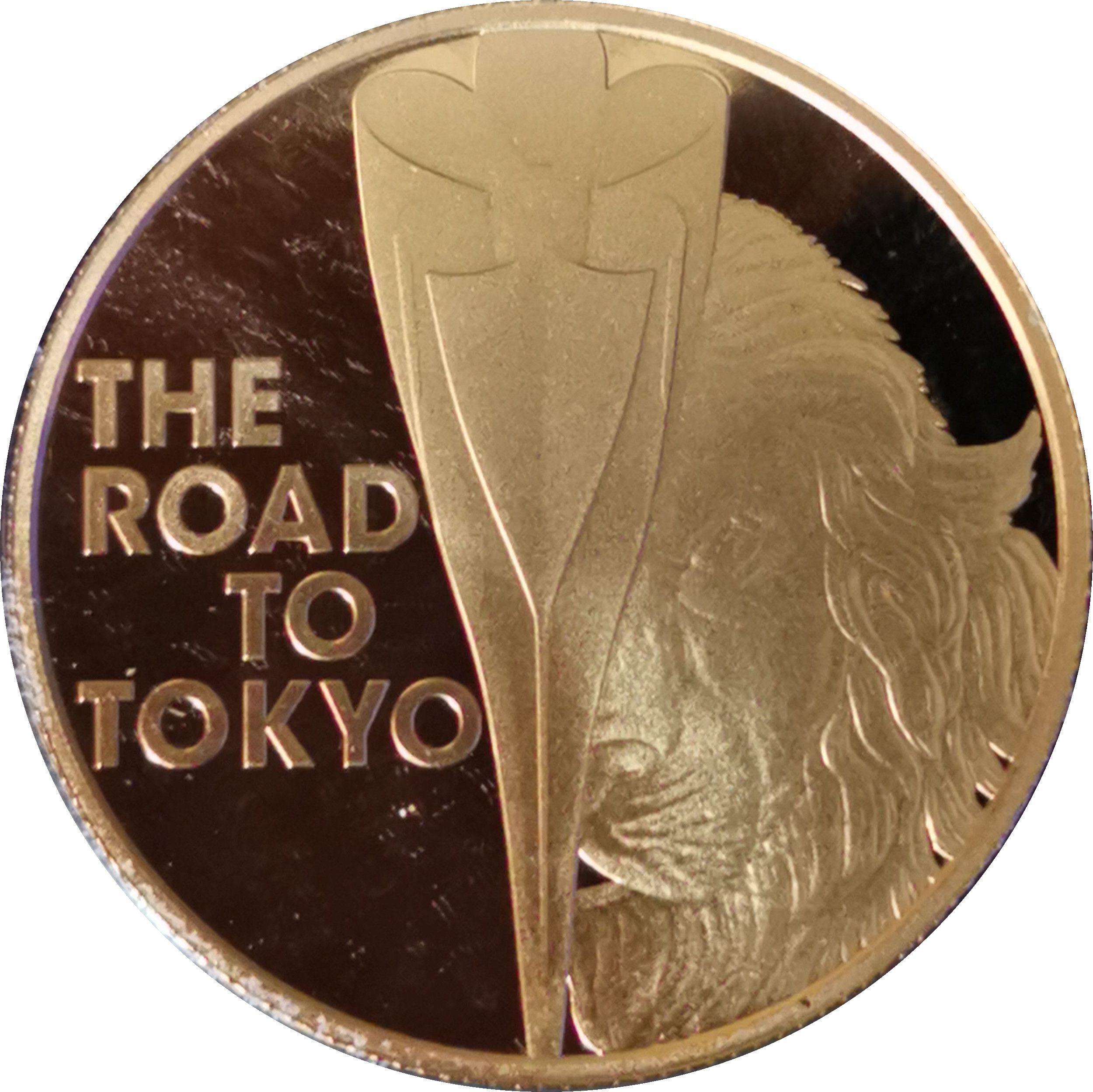 Опис: На зворотному боці зображено британського лева та палкий вогонь Олімпійського вогню (а саме точний дизайн олімпійського факела Токіо). На протилежному боці від лева розміщено напис «Шлях до Токіо».