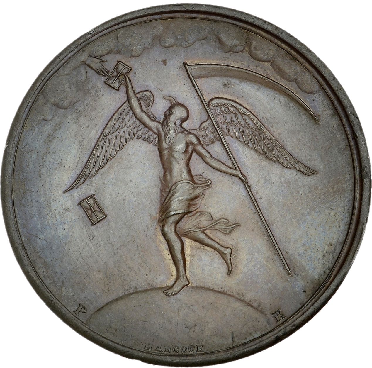 Опис: Фігура Часу, яка впустила один пісочний годинник, отримує інший від небесної руки.