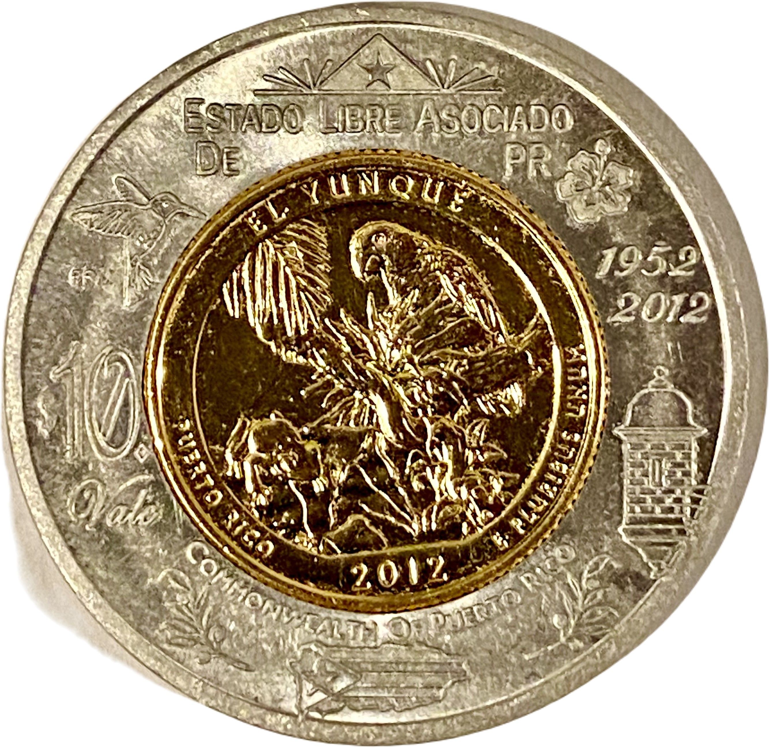 Опис: 25-центова монета Пуерто-Рико 2012 року в алюмінієвому кільці. Терміни та зображення, властиві Пуерто-Рико.
