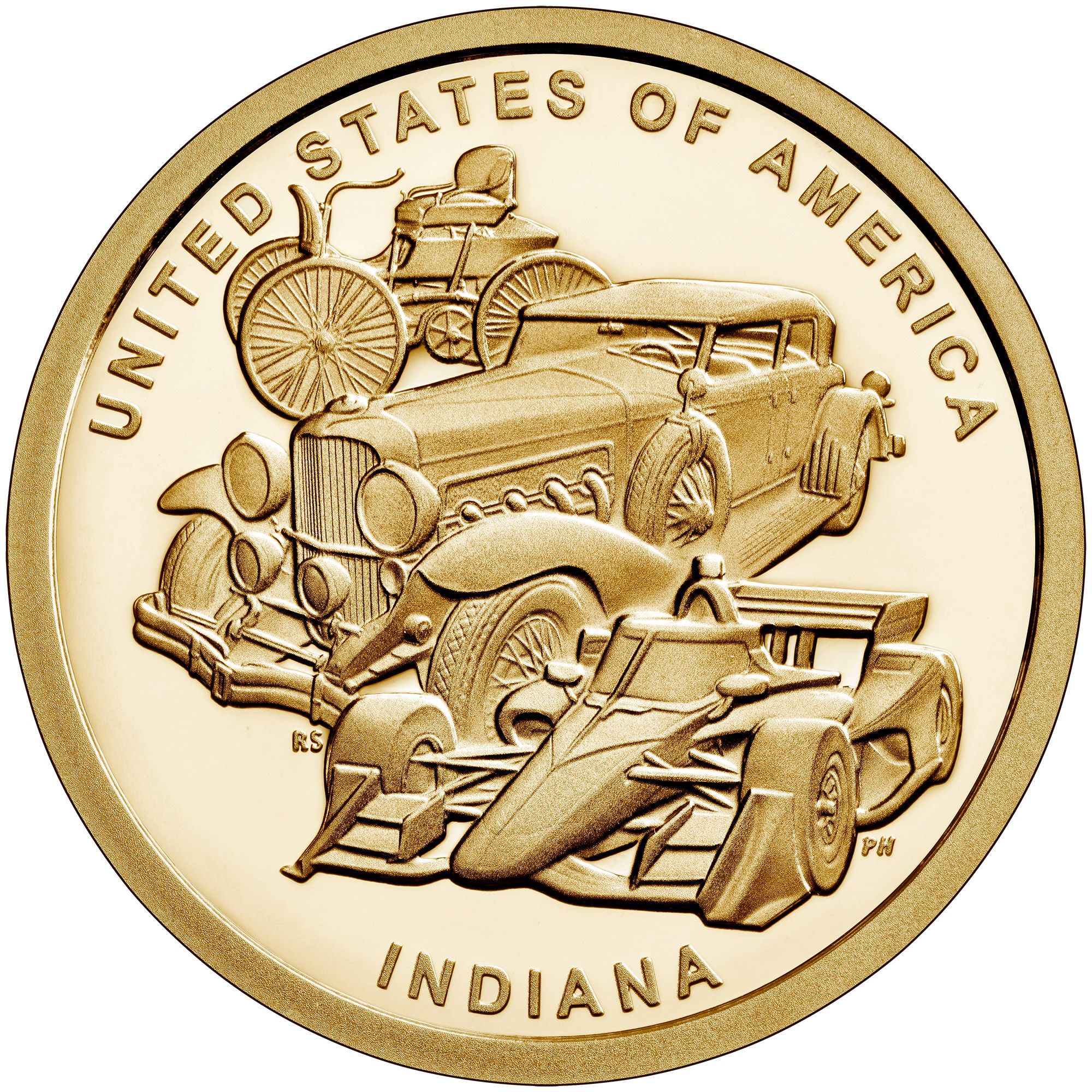 Опис: Серія транспортних засобів, що демонструють інновації Індіани вчора і сьогодні. Зверху вниз дизайн включає автомобіль раннього типу на бензині, зображення класичного автомобіля та новітню модель гоночного автомобіля в стилі Інді.