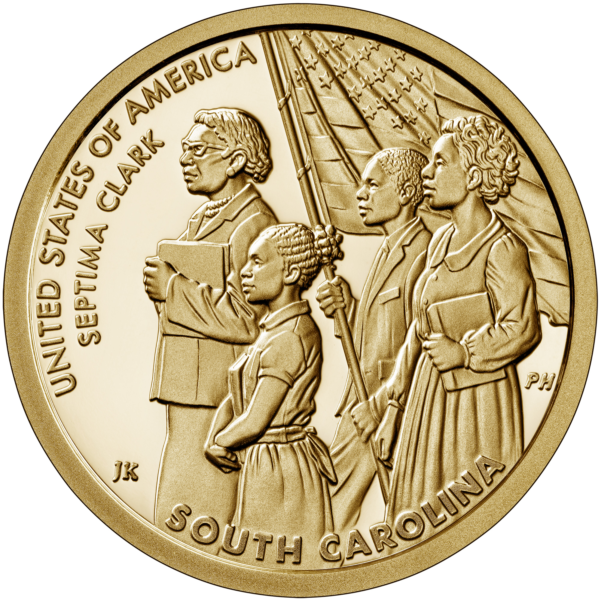 Опис: Педагог і активістка руху за громадянські права Септіма Поінсетт Кларк. На монеті зображено пані Кларк, яка крокує разом із трьома молодими афроамериканськими студентами, які несуть книги та американський прапор, що символізує необхідність освіти та грамотності серед пригноблених людей для розширення їхніх прав і можливостей та реалізації громадянських прав.