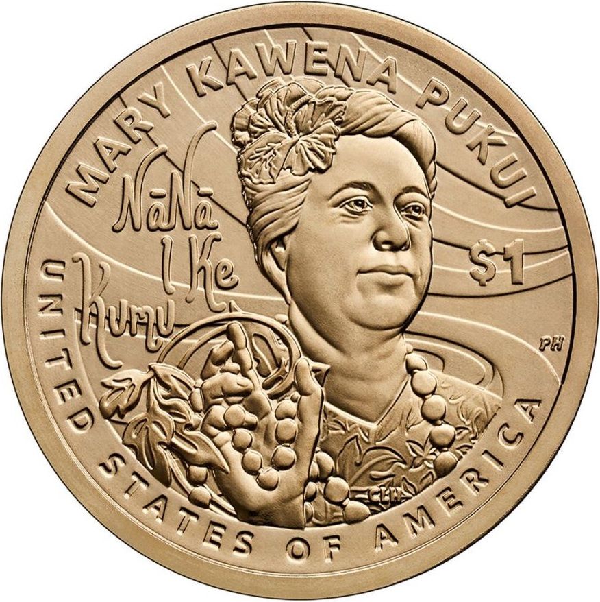 Опис: На реверсі (зворотній стороні) зображена Мері Кавена Пукуї, яка носить квітку гібіскуса, гірлянду з горіхів кукуї та мумуу, прикрашену принтом «алоха». На тлі зображено стилізовані зображення води. Написи включають «Сполучені Штати Америки», «$1» та «Nānā I Ke Kumu», що буквально перекладається як «Дивись на джерело».