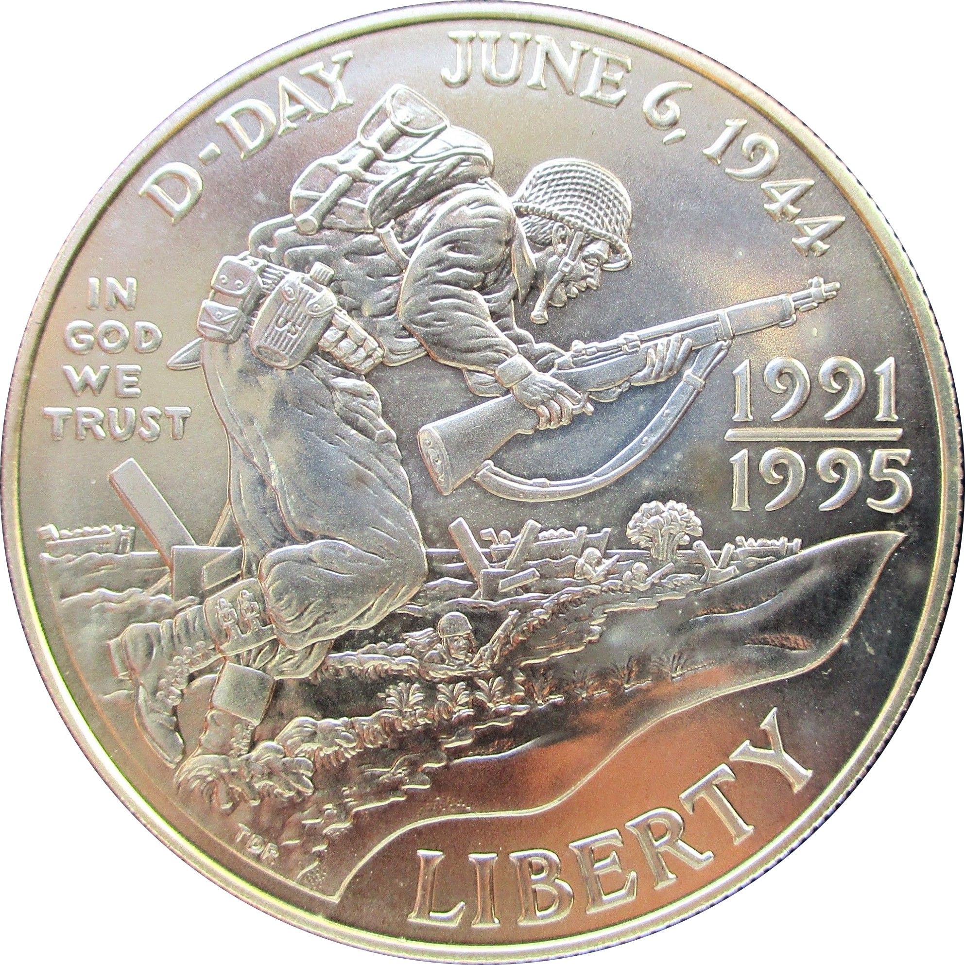 Опис: Солдат, що тримає гвинтівку, йде праворуч, стоячи у воді на пляжі. На задньому плані — два човни, кілька людей у воді. Напис навколо аверсу.