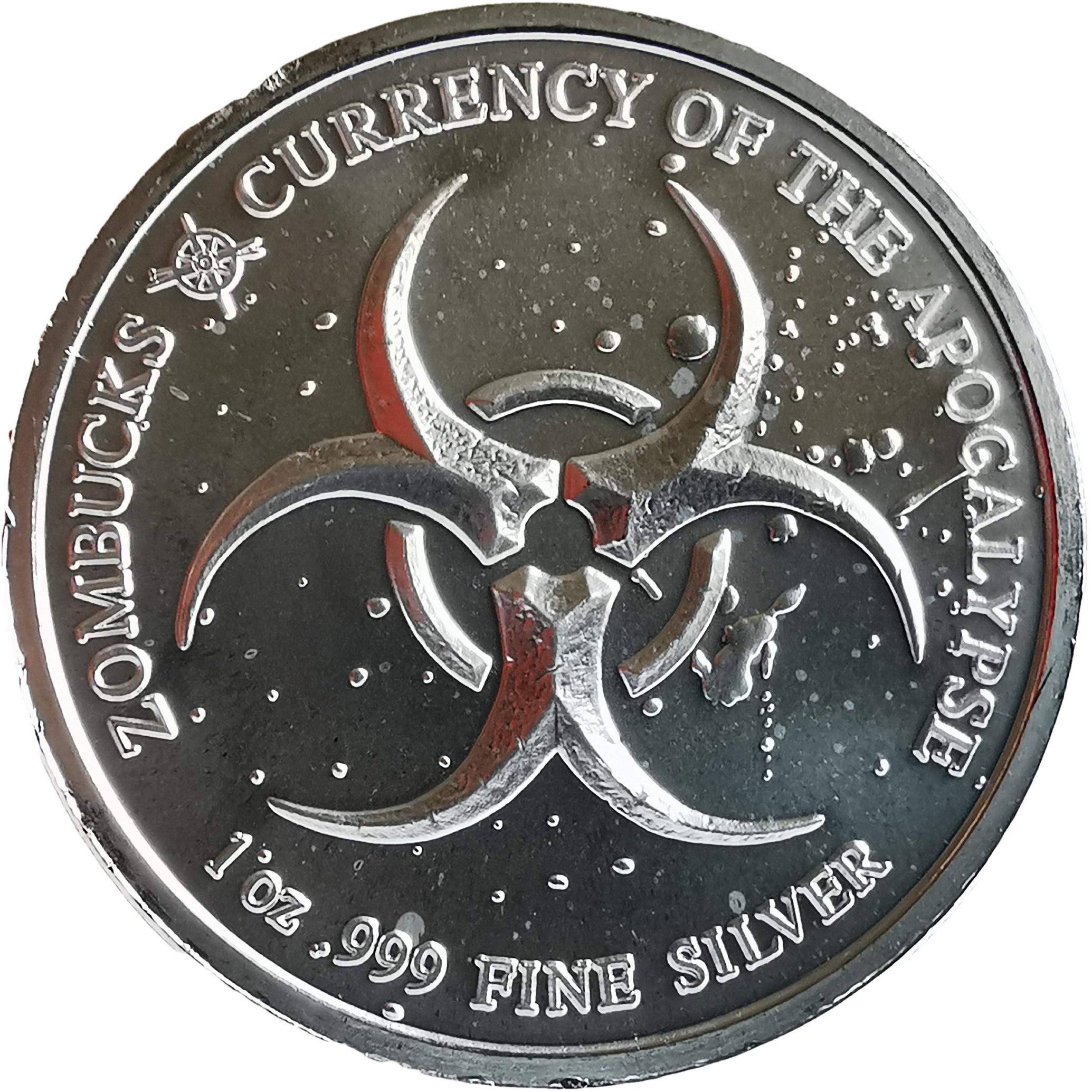 Опис: Міжнародний символ біологічної небезпеки в центрі. Напис у верхній частині «ZOMBUCKS CURRENCY OF THE APOCALYPSE» (Зомбаки — валюта апокаліпсису). У нижній частині — інформація про вагу та пробу.