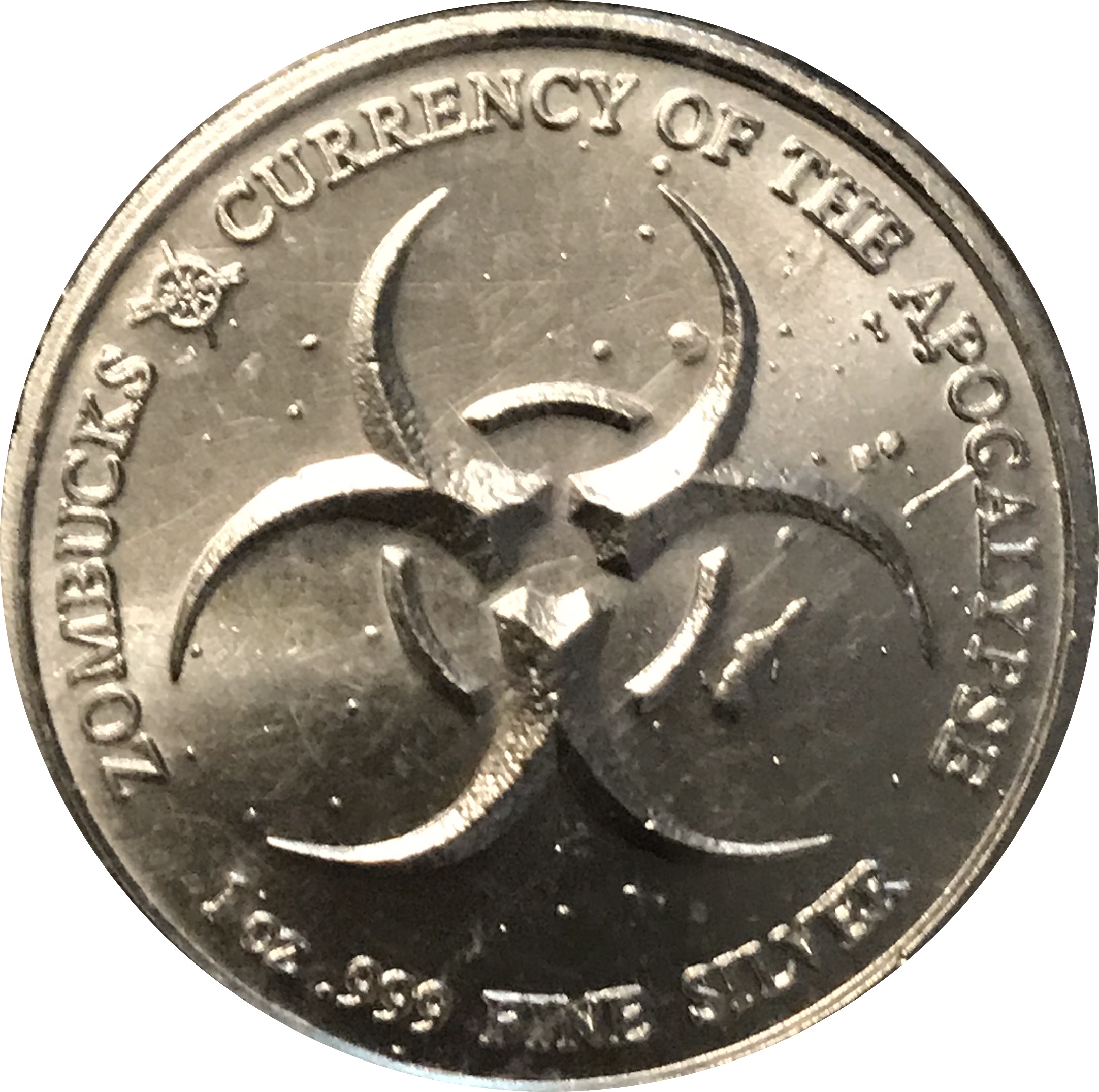 Опис: Міжнародний символ біологічної небезпеки в центрі. Напис у верхній частині «ZOMBUCKS CURRENCY OF THE APOCALYPSE» (Зомбаки — валюта апокаліпсису). У нижній частині — інформація про вагу та пробу.