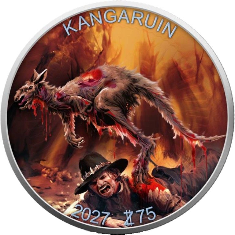 Опис: Зображення зомбіфікованого стрибаючого кенгуру з назвою раунду зверху, роком та номіналом Zombucks знизу.