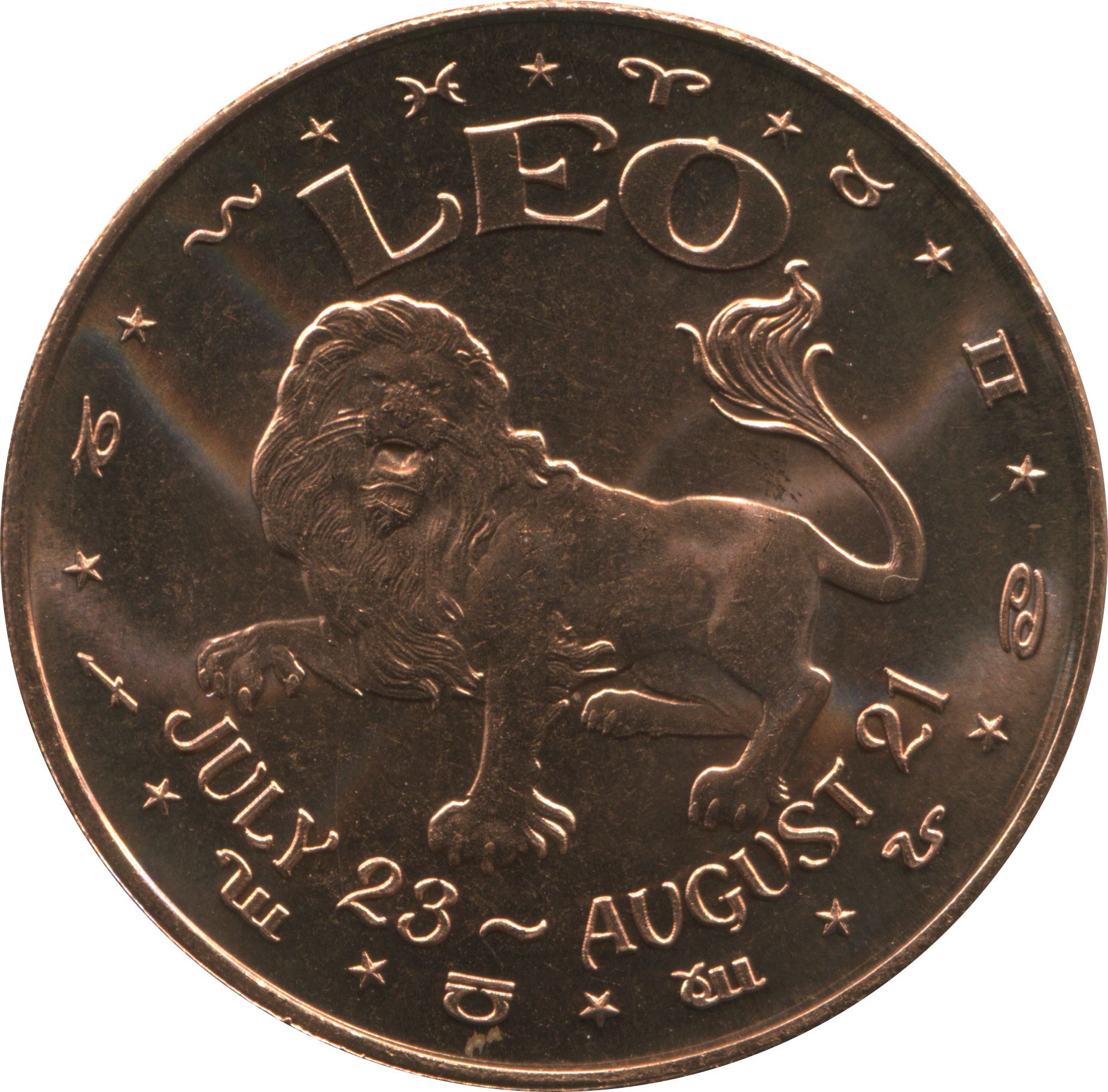 Опис: Лев із західними астрологічними/зодіакальними символами та зірками біля краю.