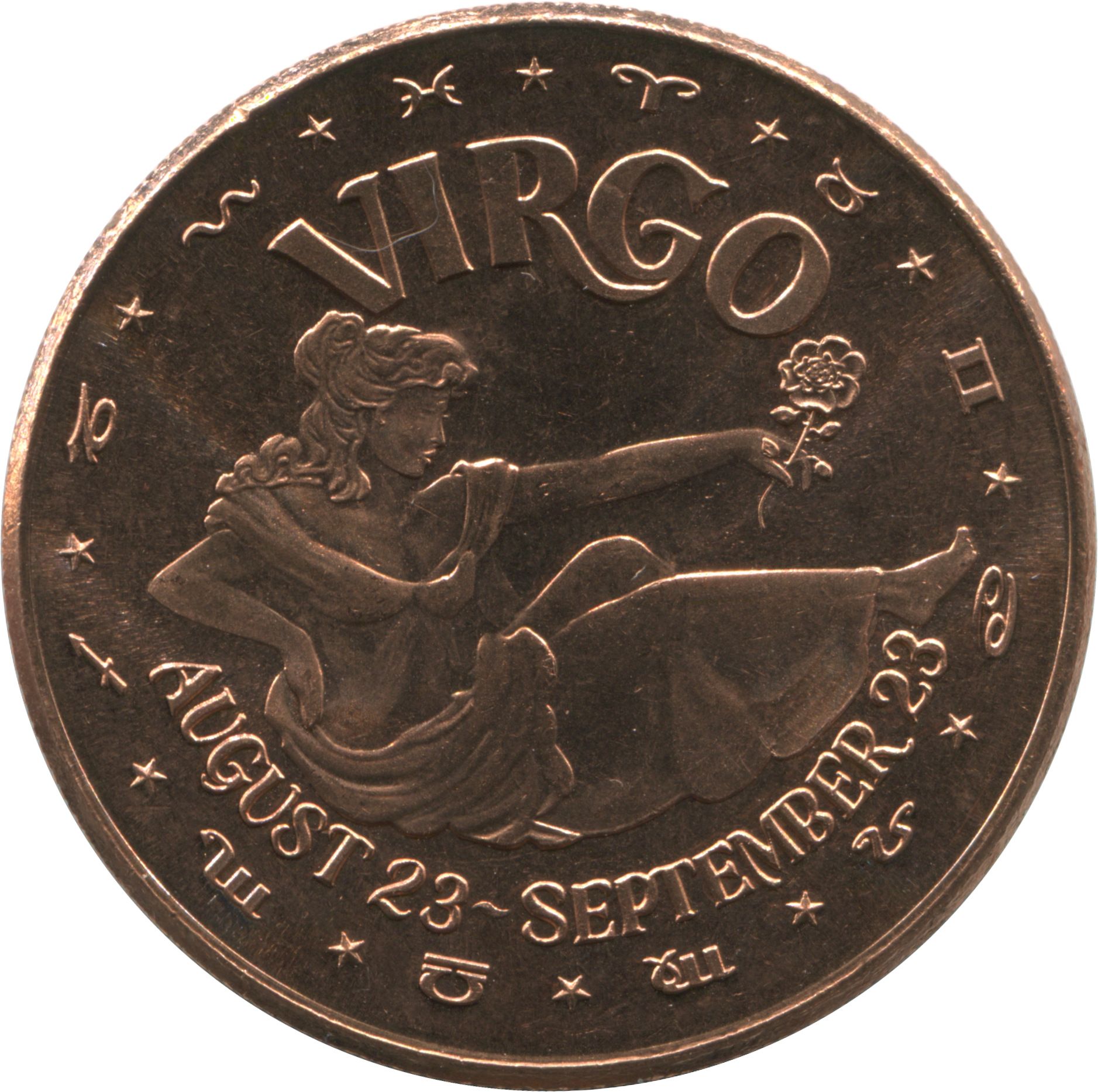 Опис: У центрі зображена сидяча жінка, яка тримає квітку, а по краю — західні астрологічні/зодіакальні символи та зірки.