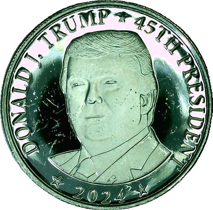 Опис: На аверсі зображено бюст Дональда Трампа, звернений ліворуч. На зовнішньому обідку розміщено три написи, розділені зірками.