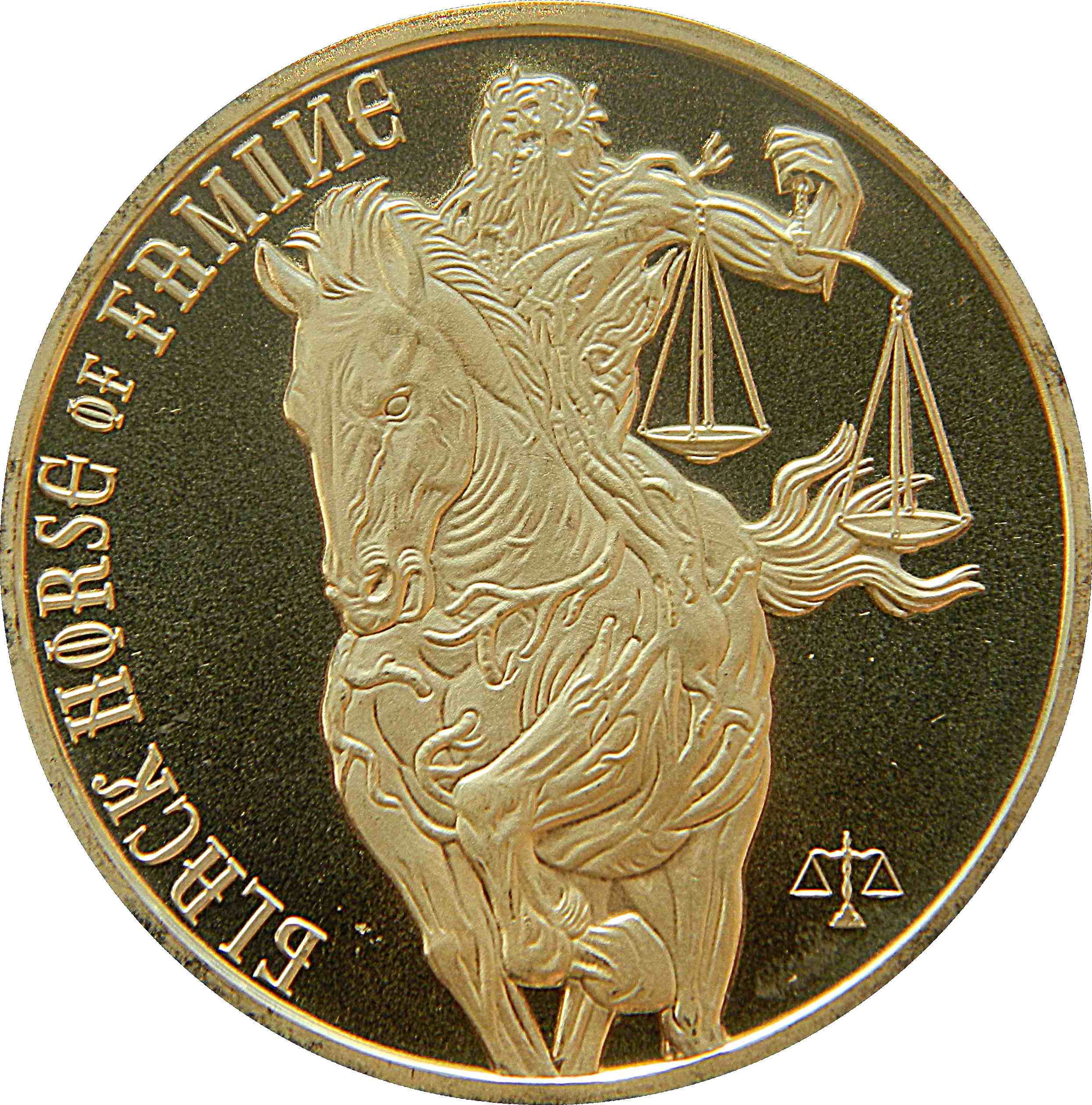 Опис: Зблизька зображено коня та вершника, що несуть ваги. Напис біля лівого краю, знак ваг у правому нижньому куті.
