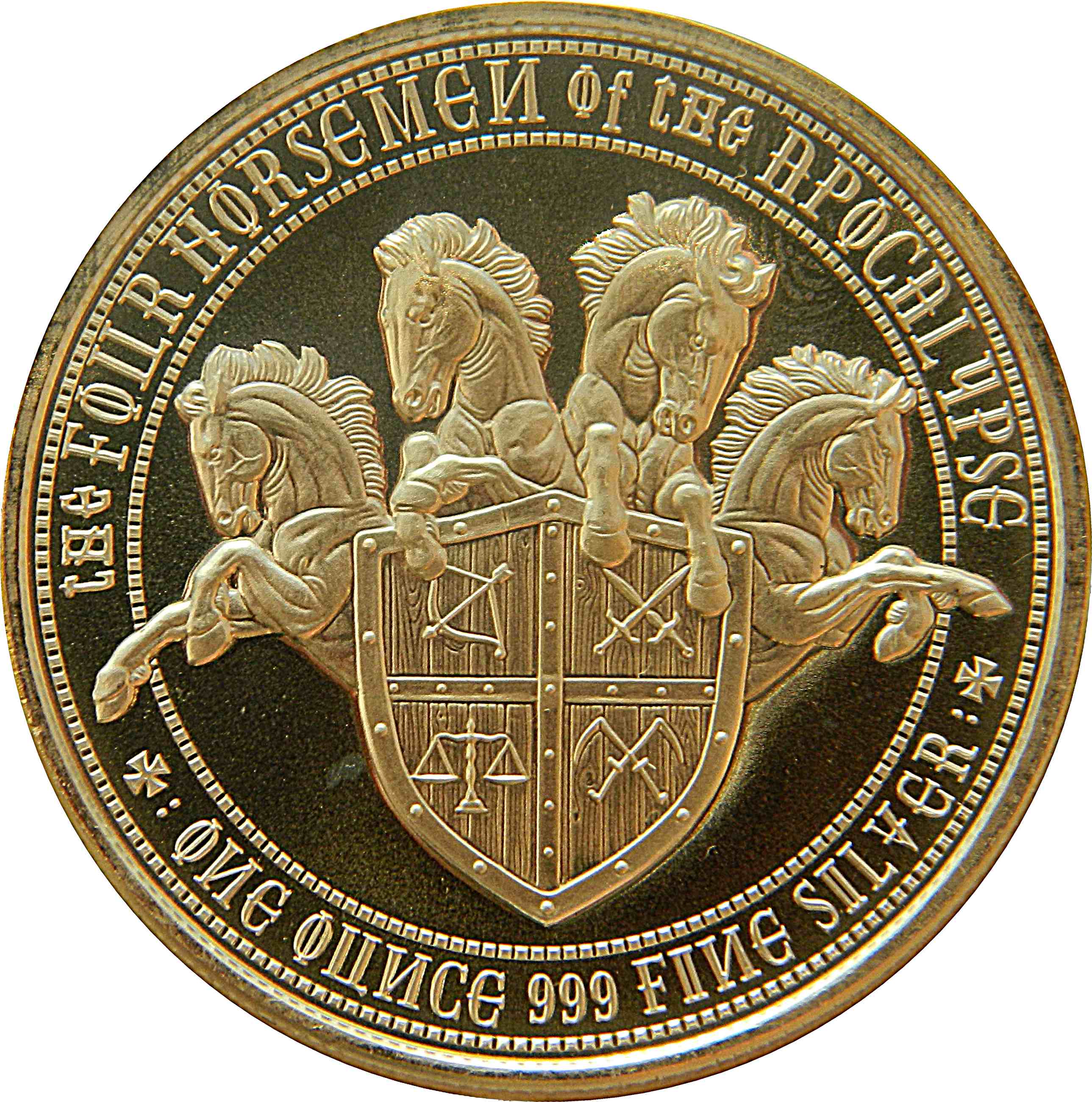 Опис: 4 голови коней без вершників з передніми копитами, що стрибають через щит з привілейованими знаками, що символізують 4 вершників, оточених написом.