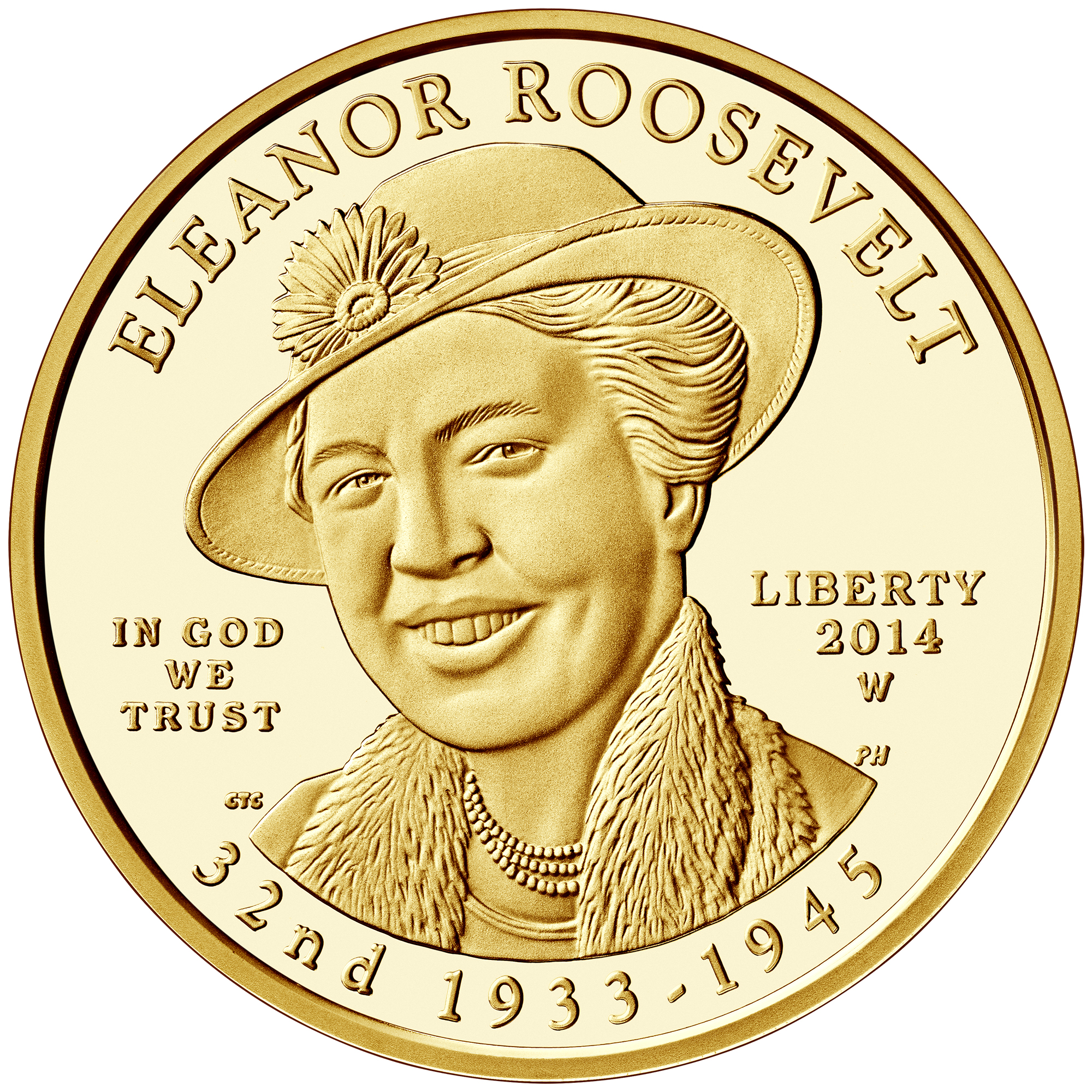 Опис: The reverse design of the coin was inspired by a quote from Adlai Stevenson following her death: “She would rather light a candle than curse the darkness, and her glow has warmed the world.” The design features a depiction of Mrs. Roosevelt’s hand lighting a candle with the glow from its light rising over a stylized graphic of the Earth’s horizon to symbolize her life’s work and the global impact of her humanitarian initiatives.