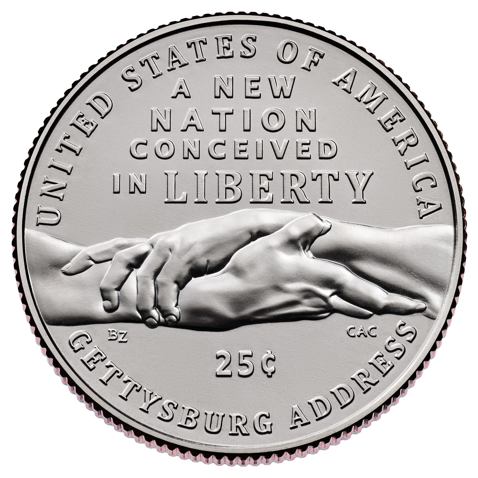 Опис: На реверсі монети розміщено напис «A NEW NATION CONCEIVED IN LIBERTY» («Нова нація, зачата у свободі») — уривок із Геттісберзької промови президента Авраама Лінкольна. Дві руки, що тримаються одна за одну, символізують зусилля Лінкольна з об’єднання нації та його заклик до американців вшанувати померлих і забезпечити, «щоб уряд народу, створений народом і для народу, не зник з лиця землі».