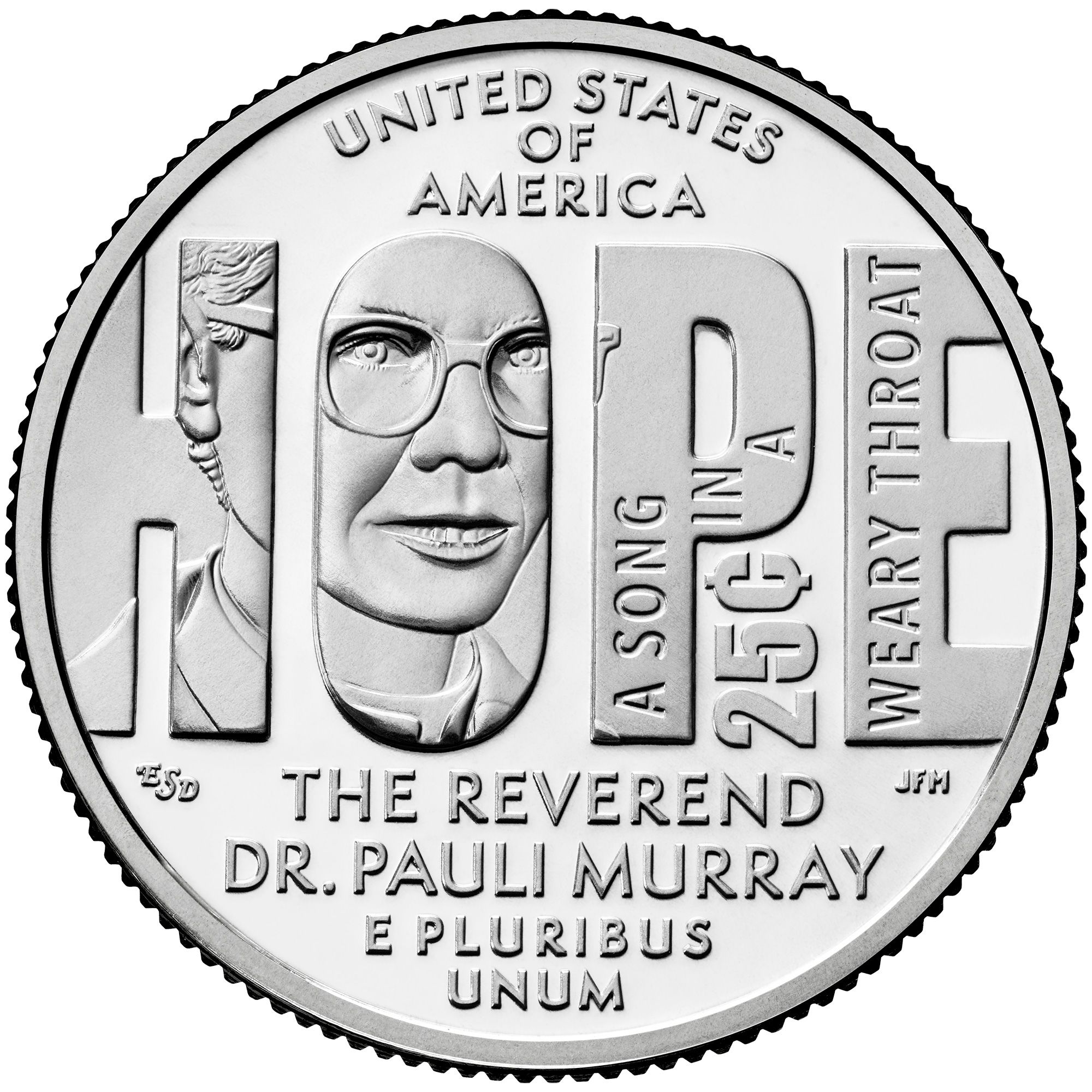 Опис: Обличчя преподобної докторки Полі Мюррей в окулярах у формі слова «HOPE» (надія) символізує переконання Мюррей у тому, що значні суспільні реформи можливі, якщо вони ґрунтуються на надії. Рядок з її вірша «Dark Testament» (Темний заповіт) характеризує надію як «A SONG IN A WEARY THROAT» (пісня в стомленому горлі), що є написом у дизайні.