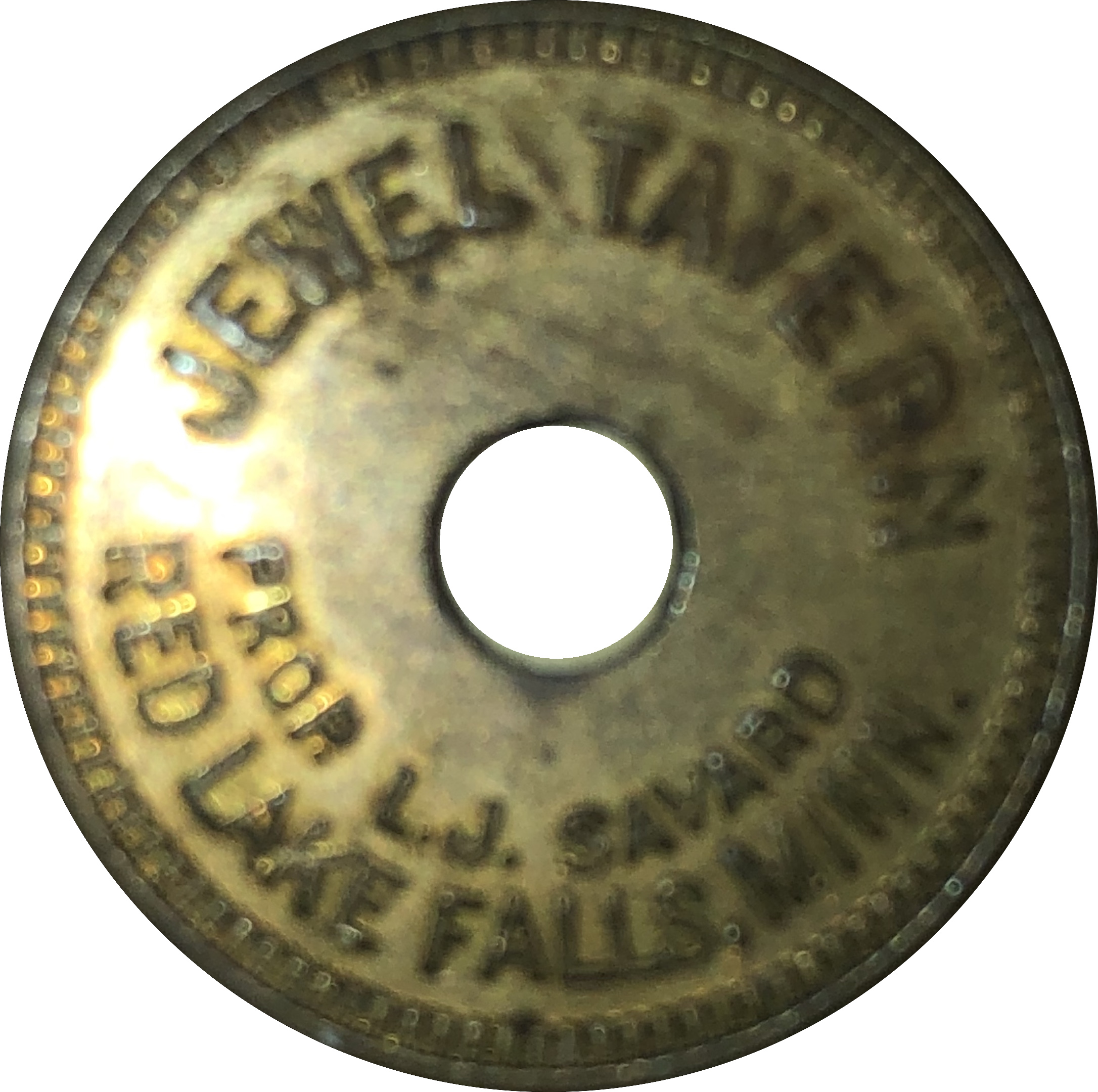Опис: По краю монети є риски, у верхній частині напис «JEWEL TAVERN», у центрі отвір, у нижній частині напис «RED LAKE FALLS, MINN.», а трохи вище — «PROP. L. J. SAVARD».