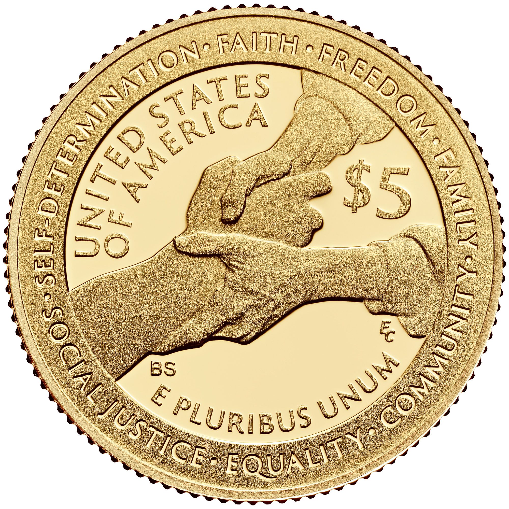 Опис: Обидві руки однієї людини міцно обіймають руку іншої людини, що символізує допомогу та турботу, які Гаррієт Табман надавала іншим протягом усього свого життя. Навколо рук розміщені написи із сімома основними цінностями Гаррієт Табман.