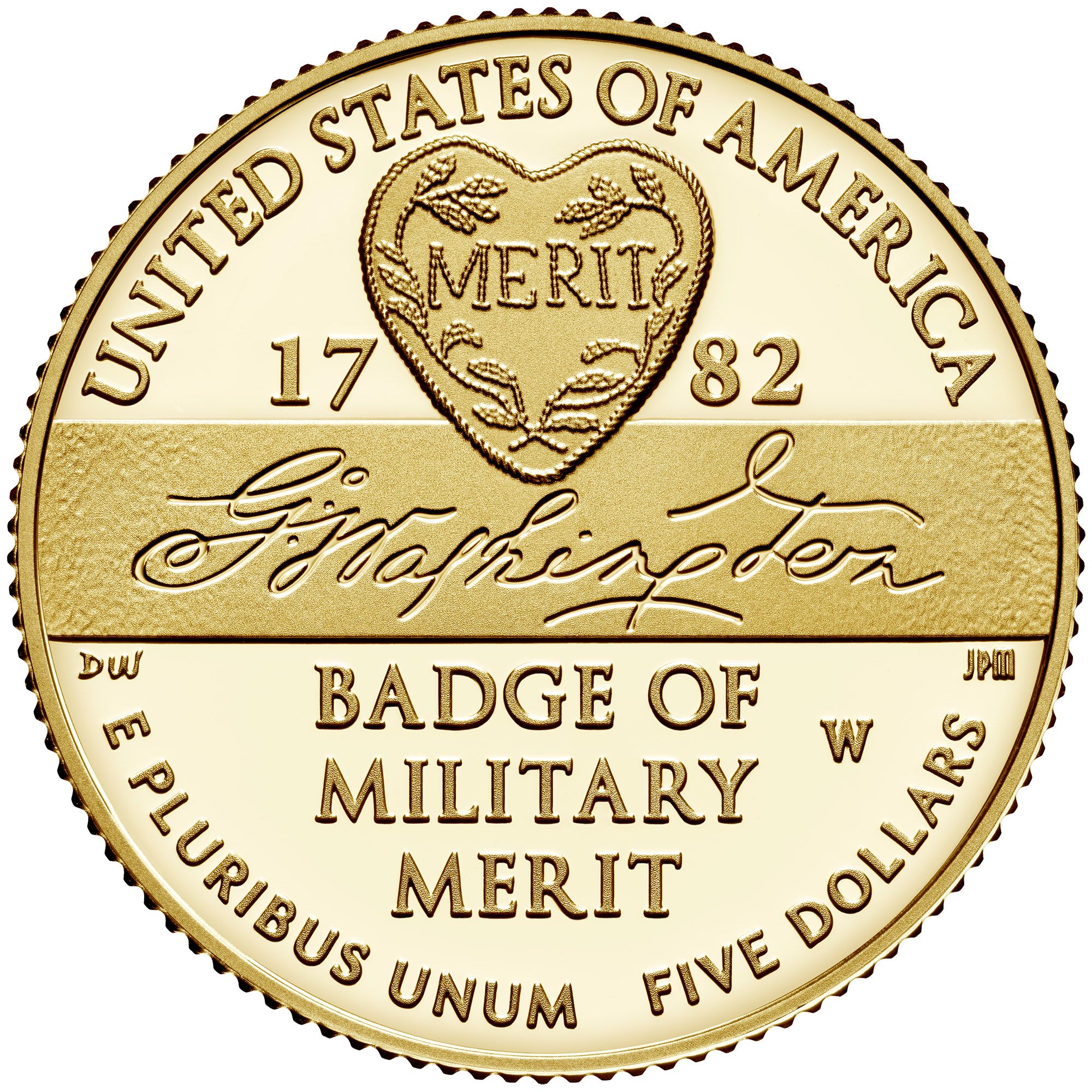Опис: Підпис Джорджа Вашингтона під знаком військової заслуги та над текстурованою смугою.