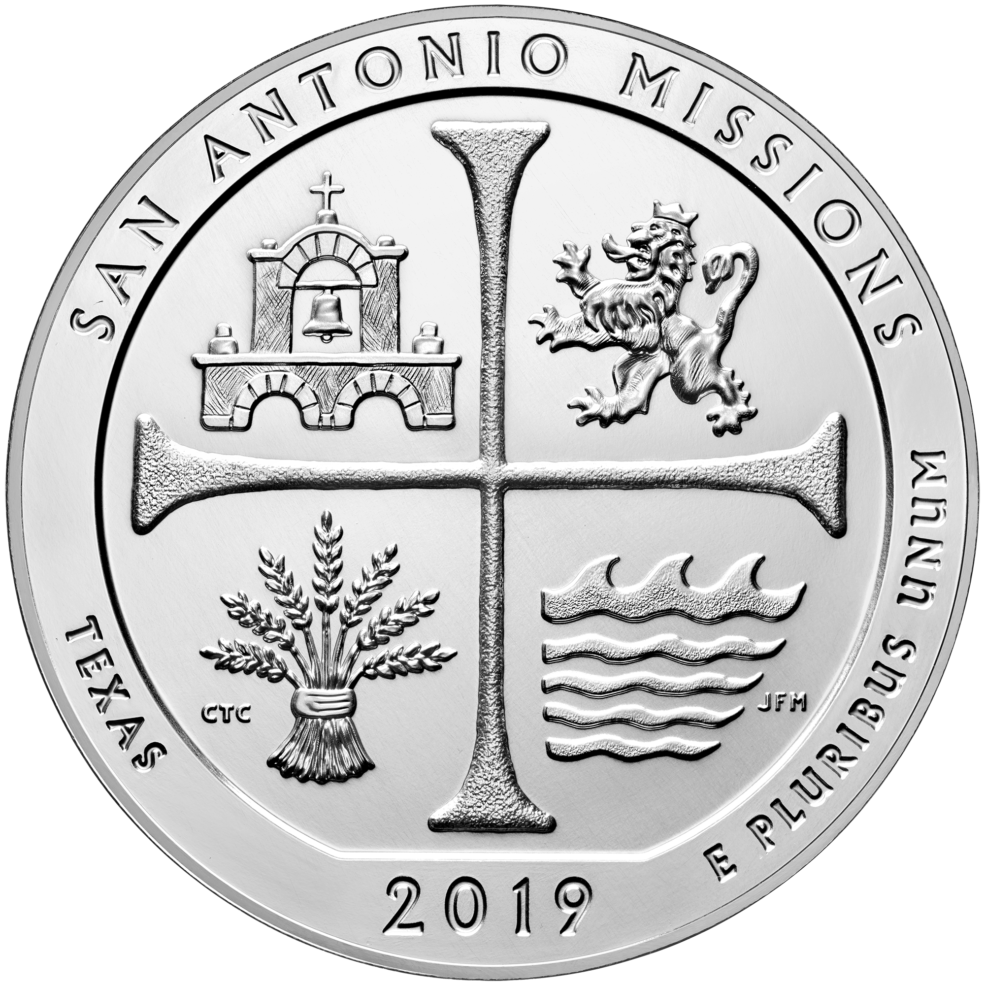 Опис: Елементи іспанської колоніальної монети «Реаль», присвяченої місіонерській діяльності. У квадрантах зображені символи місій: пшениця символізує сільське господарство; арки та дзвін символізують спільноту; лев представляє іспанську культурну спадщину; а символ річки Сан-Антоніо символізує методи зрошення та ресурси, необхідні для життя.
