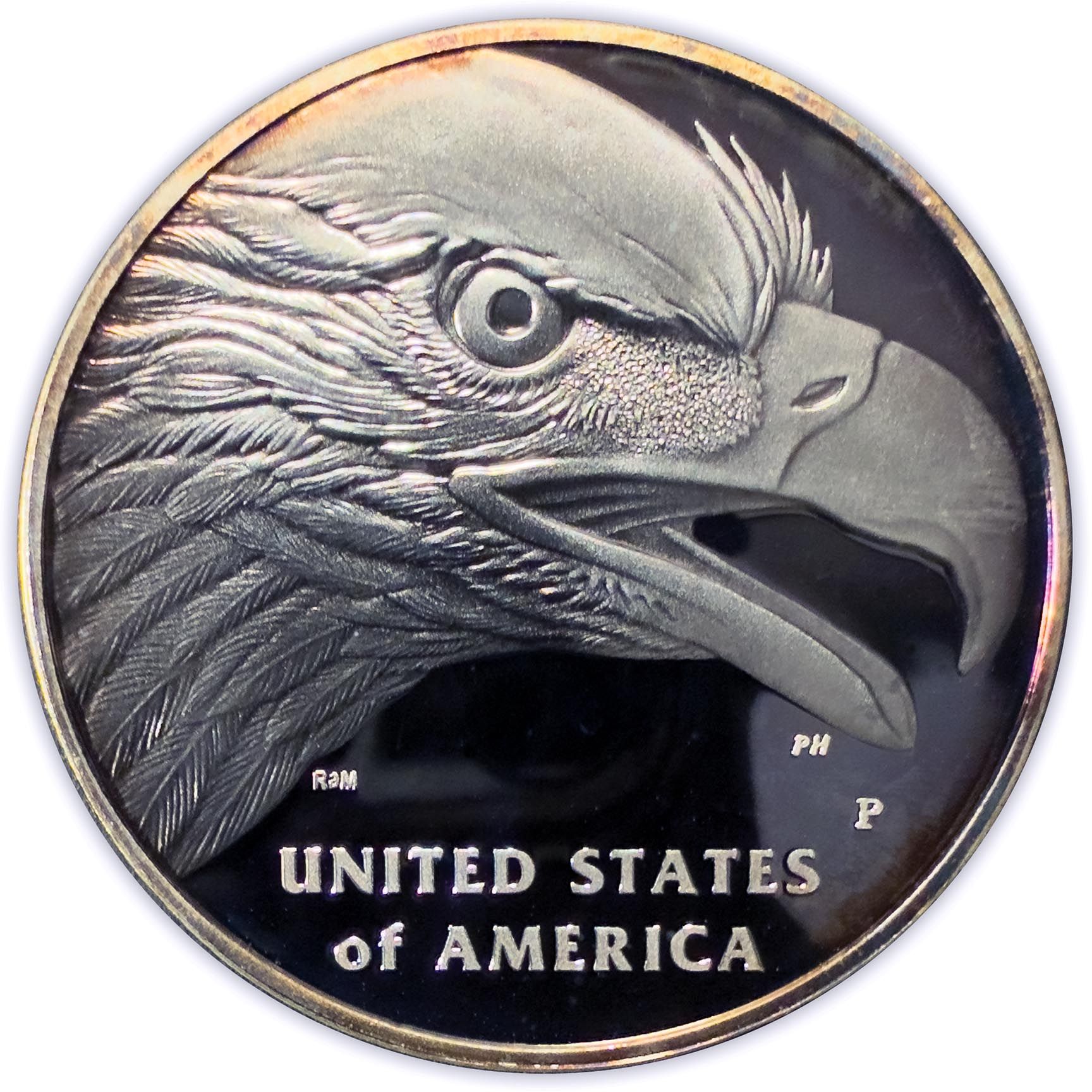 Опис: Профіль, голова білоголового орла (Haliaeetus leucocephalus), звернена вправо, дзьоб відкритий. Напис знизу.