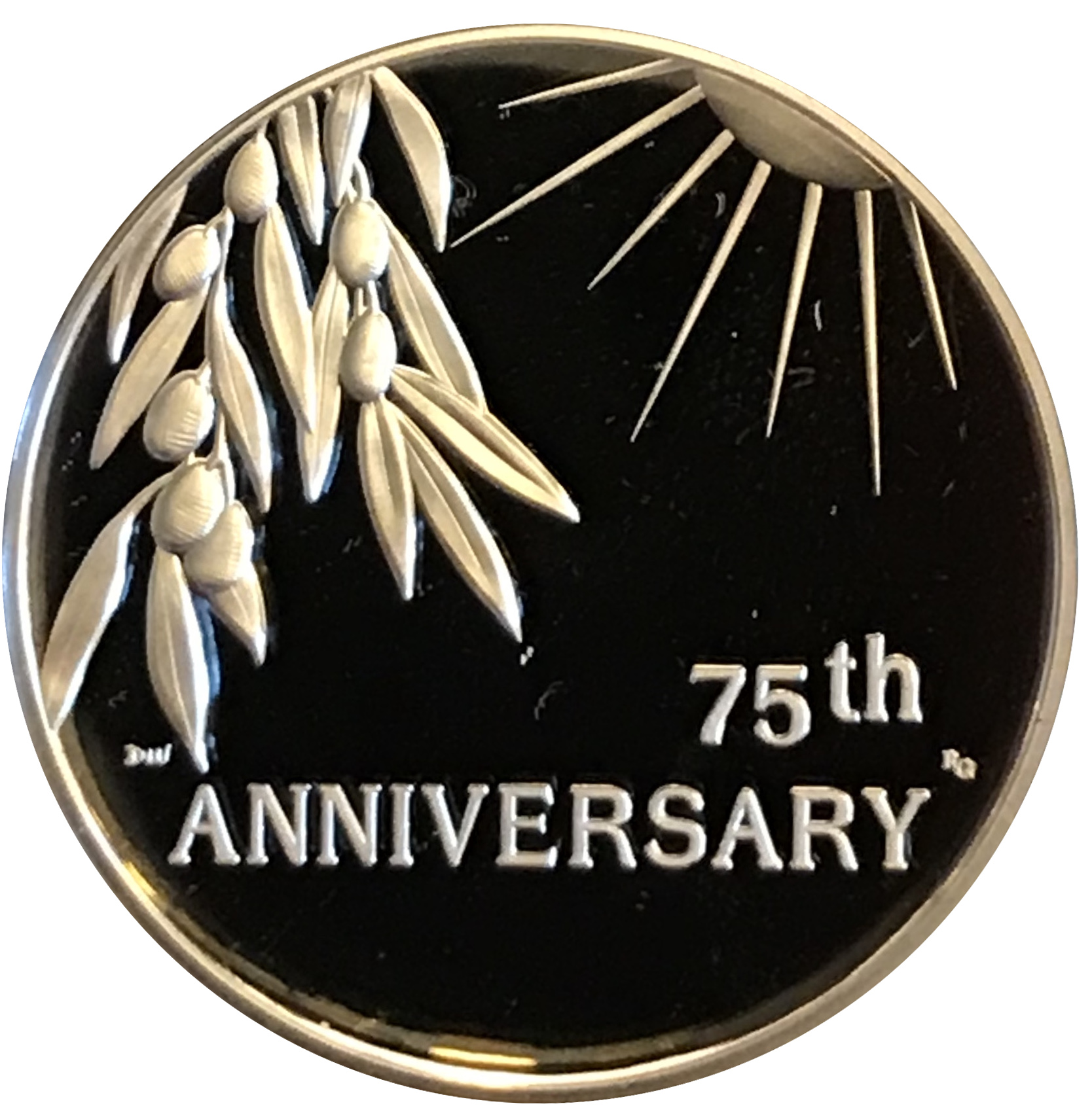 Опис: Цей дизайн повторює елемент сонця на аверсі медалі «Перемога у Другій світовій війні» 1945 року. Сонце з тієї медалі, через 75 років, піднялося до полуденного блиску. Воно світить на оливкові гілки. Напис «75-та річниця».
