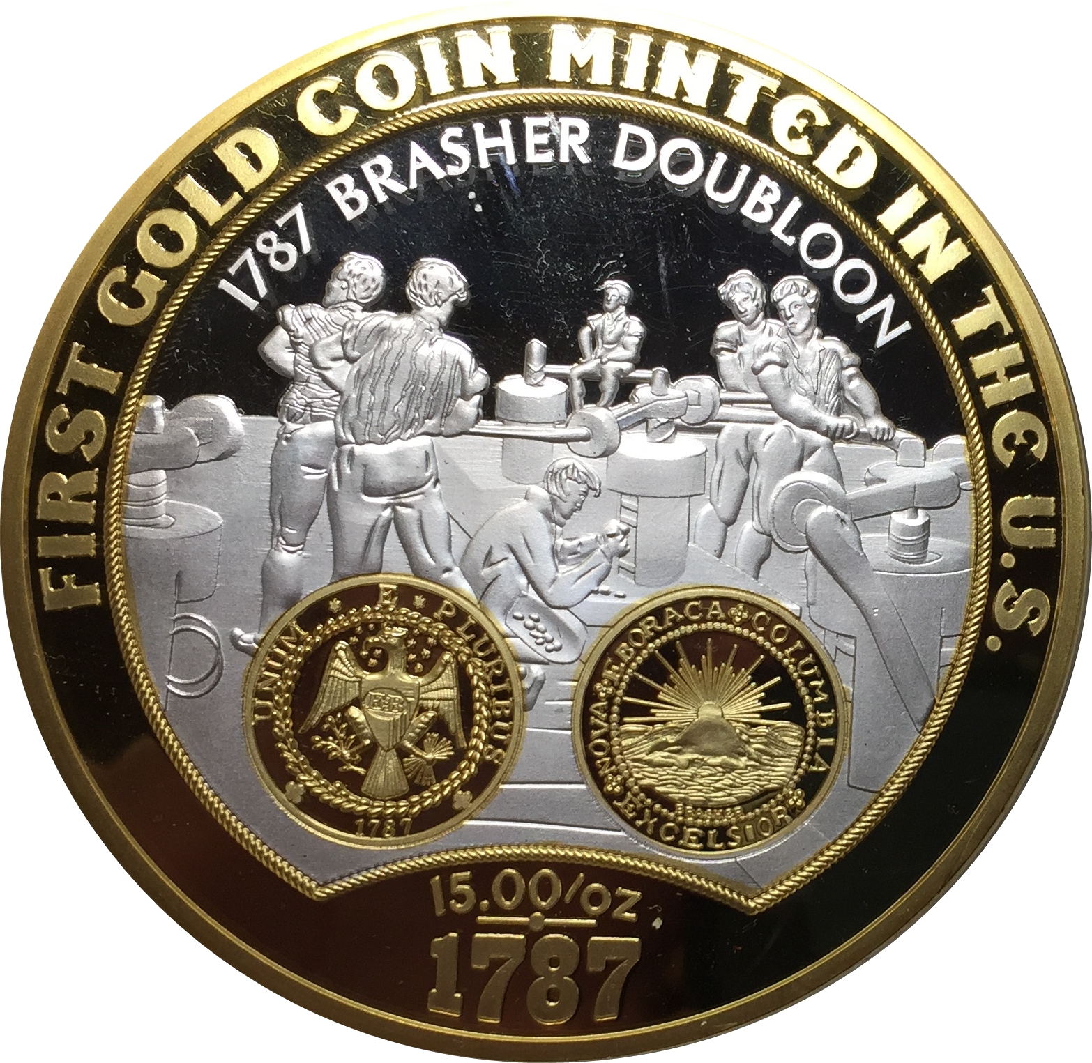 Опис: Сцена карбування та дублон Брашера 1787 року, розроблений і викарбуваний у 1787 році нью-йоркським ювеліром та золотарем Ефраїмом Брашером.