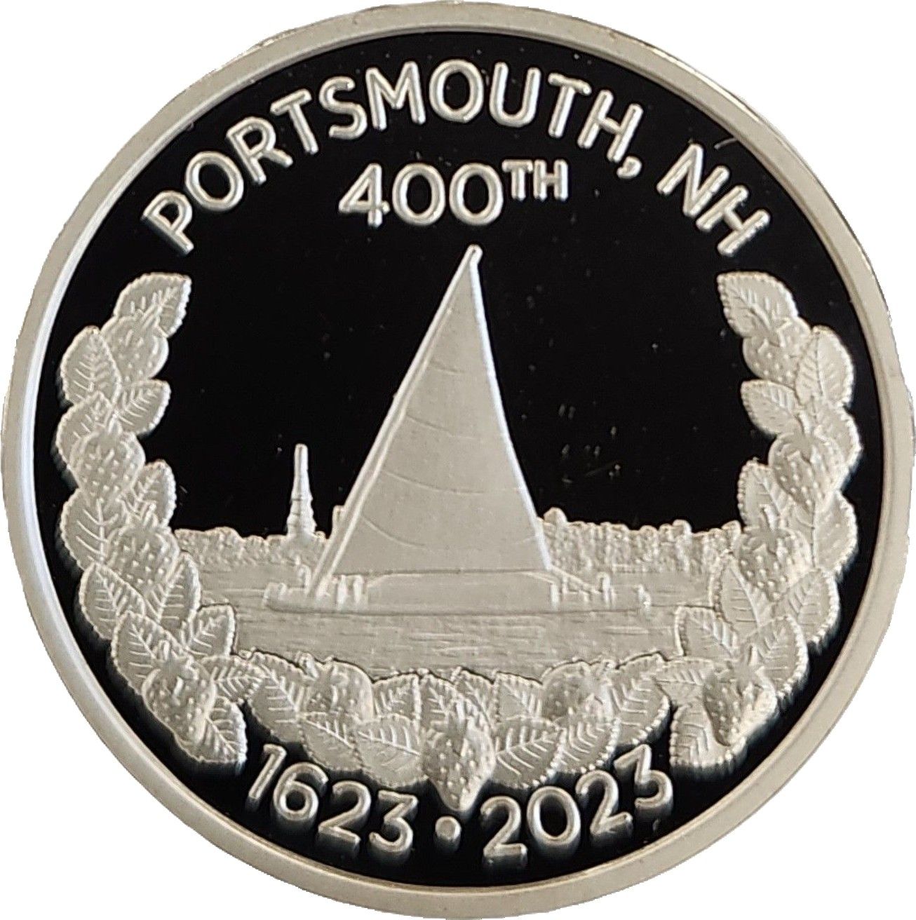 Опис: Гундалоу, оточений вінком із полуниць, з текстом зверху та датами знизу. На задньому плані видно місто Портсмут, штат Нью-Гемпшир, та шпиль Північної церкви.