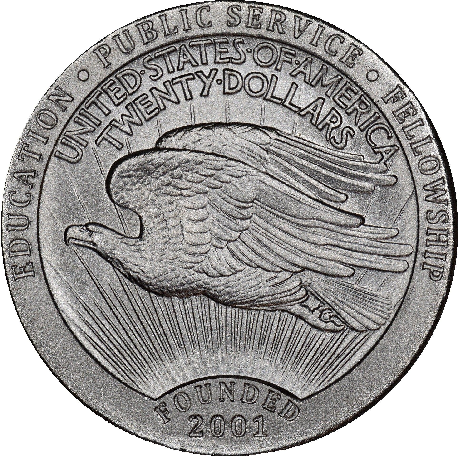Опис: Репліка реверсу монети номіналом 20 доларів Августа Сен-Годена, оточена написом.