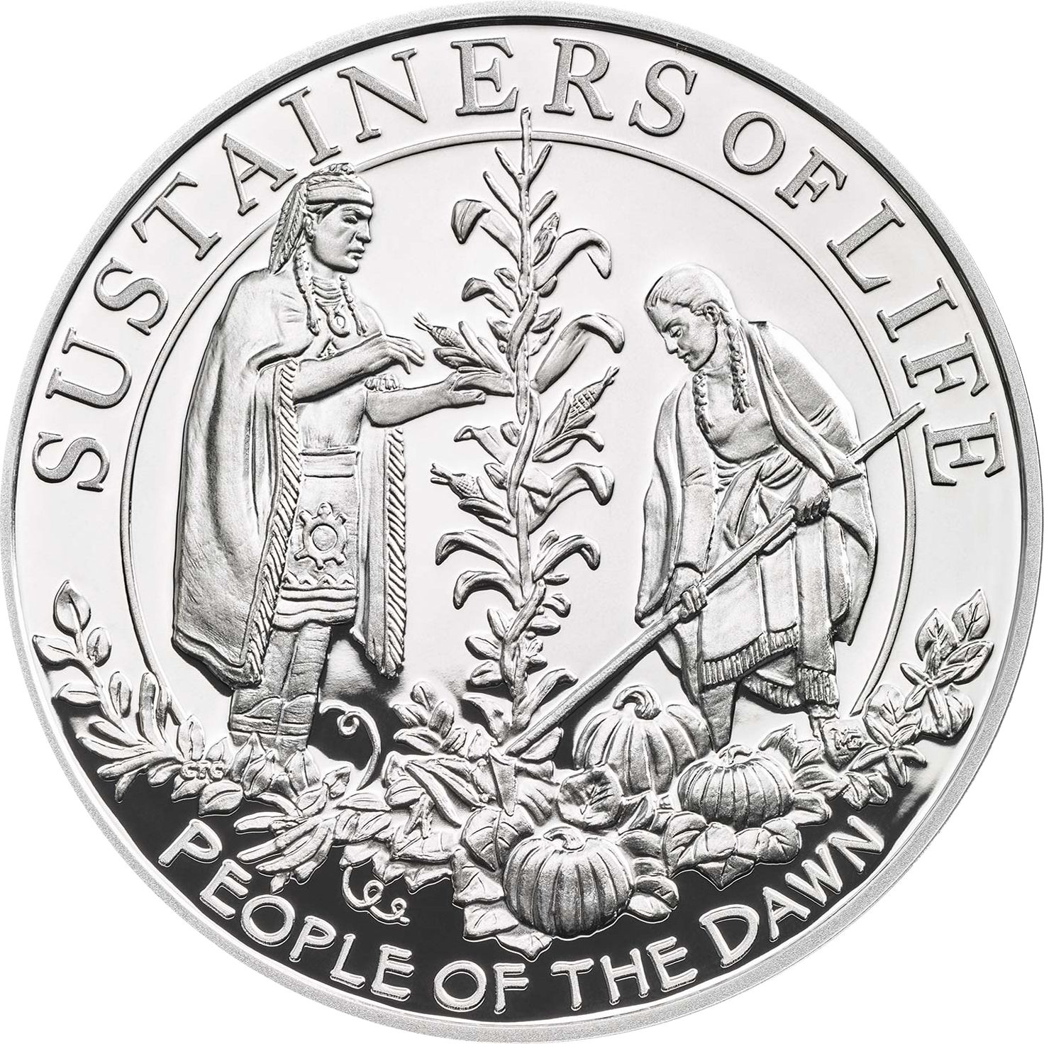 Опис: Чоловік і жінка з племені вампаноагів використовують техніку посадки, яка застосовувалася для вирощування кількох культур, що були основними продуктами харчування для народу вампаноагів. Цей метод допомагав підтримувати здоров'я ґрунту, зберігаючи ресурси для щорічних посадок і успішних врожаїв. Напис «ПІДТРИМУВАЧІ ЖИТТЯ» нагадує не тільки про цю стійку техніку посадки, але й про важливі навички, які народ вампаноагів надав пілігримам, навчивши їх успішно садити і збирати врожай.