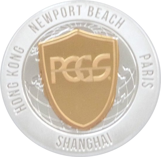 Опис: Кольоровий щит PCGS над глобусом, а по краю — написи з назвами міст, де PCGS має свої офіси. Написи вибиті.