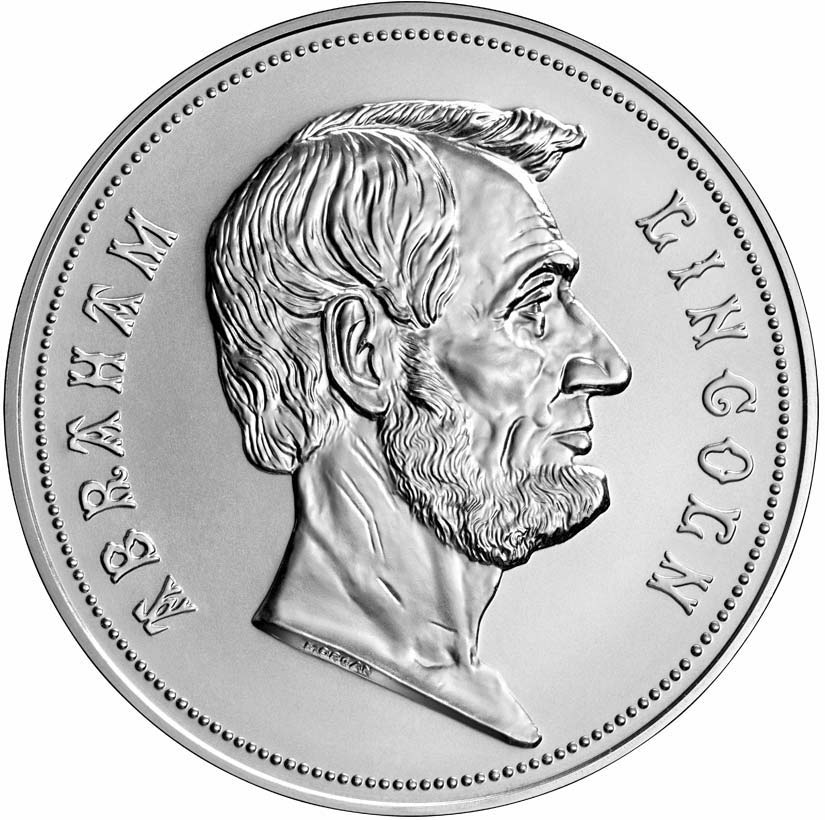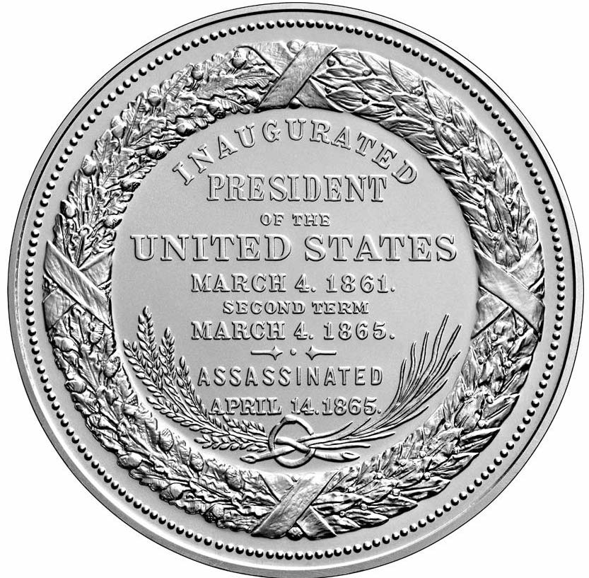 Опис: Портрет Авраама Лінкольна, звернений праворуч, навколо — напис, облямівка з рельєфним краєм.