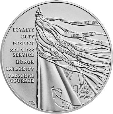 Опис: Напис із сімома основними цінностями армії ліворуч від прапора армії США. На стрічках прапора є написи про кілька великих битв.