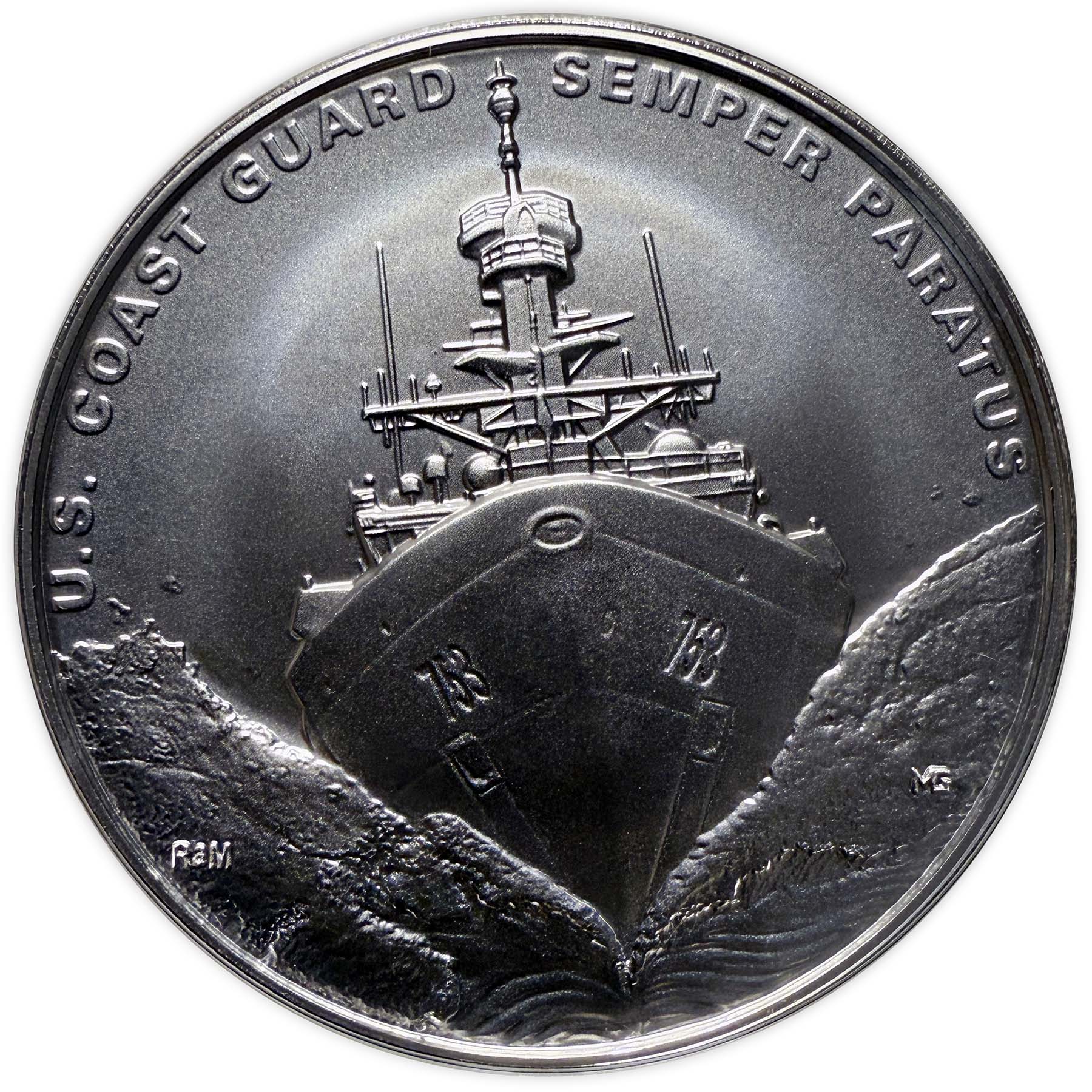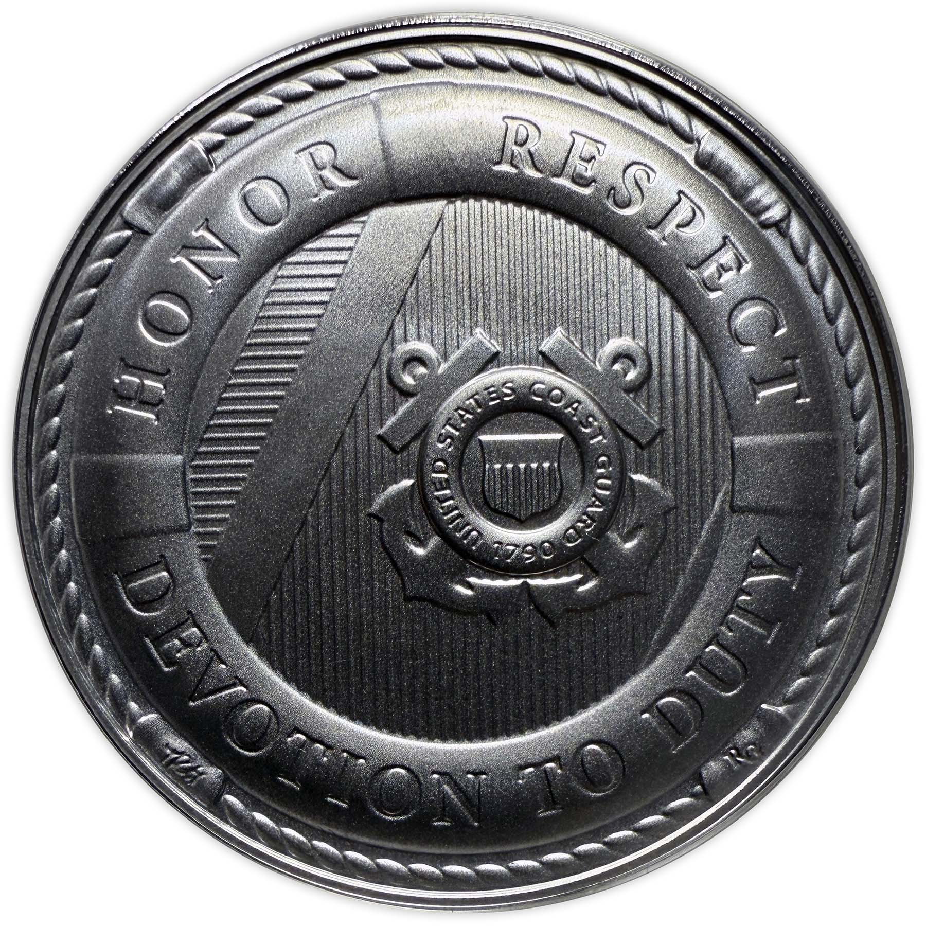 Опис: На монеті зображено рятувальне коло та смугу, виконану у геральдичній штрихувальній техніці для позначення кольору: горизонтальні лінії позначають синій колір, а вертикальні — червоний. У центрі також розміщено емблему Берегової охорони, яка є частиною смуги. На рятувальному колі викарбувано основні цінності Берегової охорони.