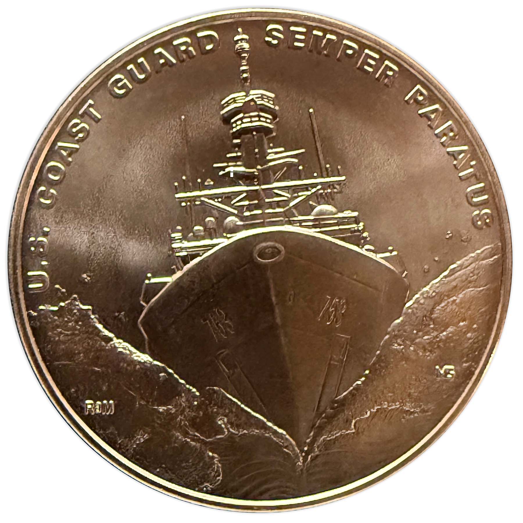 Опис: На монеті зображено рятувальне коло та смугу, виконану у геральдичній штрихувальній техніці для позначення кольору: горизонтальні лінії позначають синій колір, а вертикальні — червоний. У центрі також розміщено емблему Берегової охорони, яка є частиною смуги. На рятувальному колі викарбувано основні цінності Берегової охорони.
