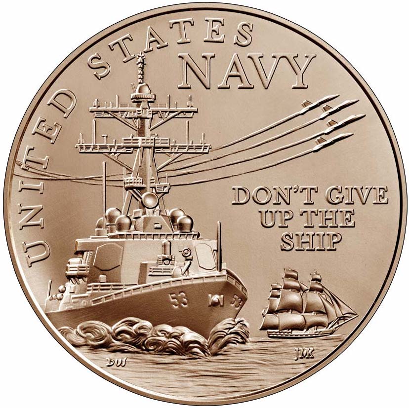 Опис: Есмінець ВМС США «Джон Пол Джонс» звернений праворуч, праворуч від нього — есмінець «Конституція». Над ними зображено чотири літаки F-18 Hornet, кожен із яких залишає за собою димовий слід у небі. Над ними — напис про військовий рід військ, а праворуч — цитата.