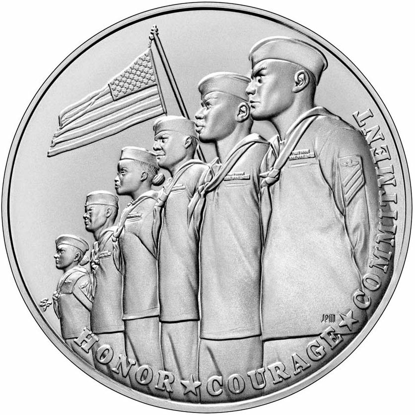 Опис: Шестеро моряків, що стоять обличчям ліворуч, на тлі американського прапора. Нижче — написи з основними цінностями ВМС.