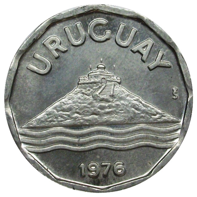 Опис: Пагорб Монтевідео, скорочена назва країни вгорі, дата внизу. Пагорб Монтевідео — один із символів державного герба, зображений у верхньому правому куті. Пагорб Монтевідео розташований на лівому березі затоки Монтевідео, а центр міста — на правому. На вершині пагорба стоїть фортеця, яка домінує (і захищає) все місто. Символізує силу.