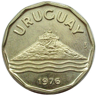 Опис: Пагорб Монтевідео, скорочена назва країни вгорі, дата внизу. Пагорб Монтевідео — один із символів державного герба, зображений у верхньому правому куті. Пагорб Монтевідео розташований на лівому березі затоки Монтевідео, а центр міста — на правому. На вершині пагорба стоїть фортеця, яка домінує (і захищає) все місто. Символізує силу.