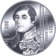 Опис: Зображення Фруктосо Рівера в центрі, номінал цифрами зліва, повернутий на 270º; дата події, ім'я особи та назва події праворуч, повернуті на 90º.