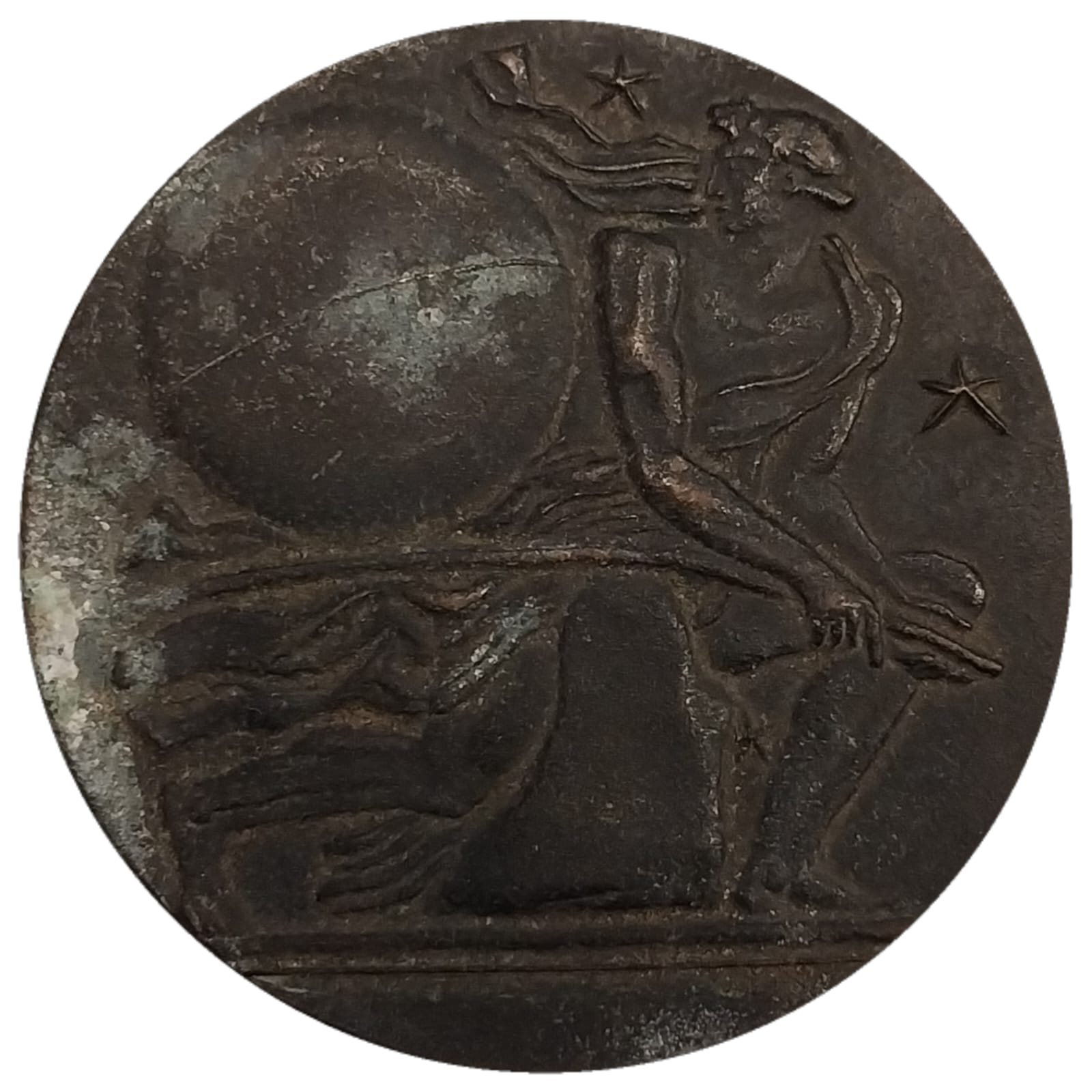 Опис: Фронтальне зображення чоловіка, який піднімає земну кулю за допомогою палиці, використовуючи її як важіль на камені. Чотири зірки. Ім'я гравера внизу.