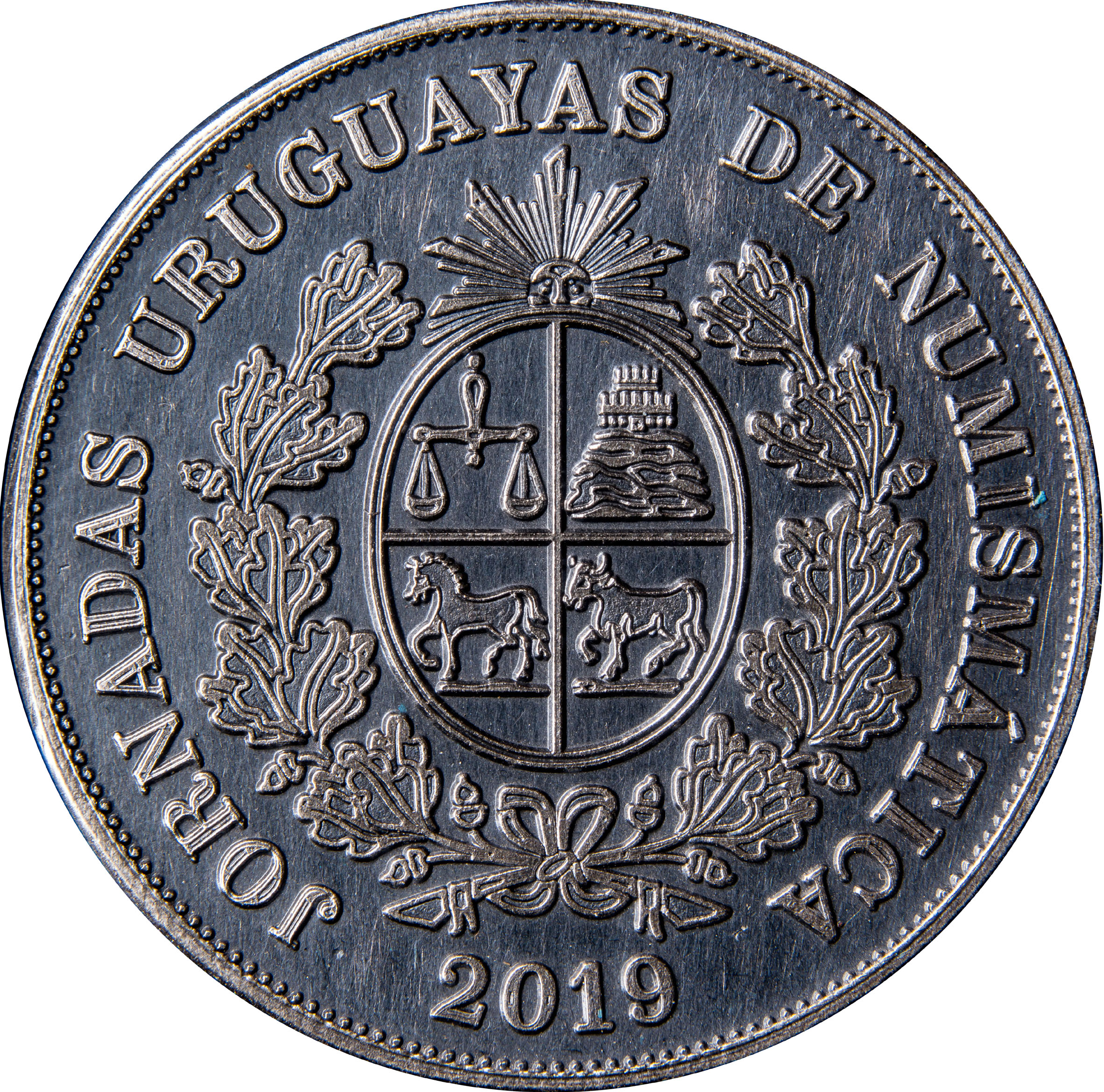 Опис: Старовинний герб Уругваю, вигнутий напис біля краю, дата внизу, ряд бусин на краю.