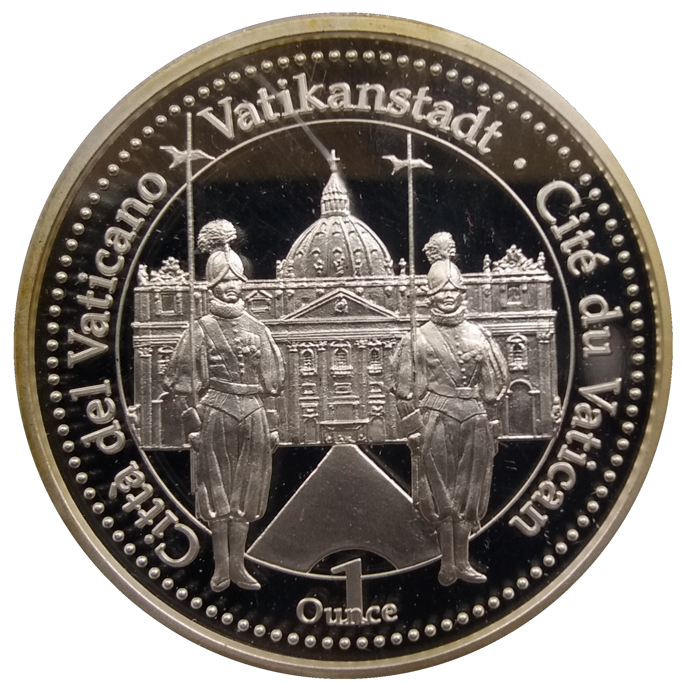Опис: Двоє швейцарських гвардійців перед базилікою Святого Петра, нижче 1 унція, текст навколо.