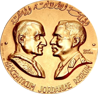 Опис: Бюсти Папи Павла VI, одягненого в зучетто і мантум, та короля Йорданії Хусейна бін Талала в цивільному одязі, розташовані один навпроти одного. Пелет ліворуч і праворуч.