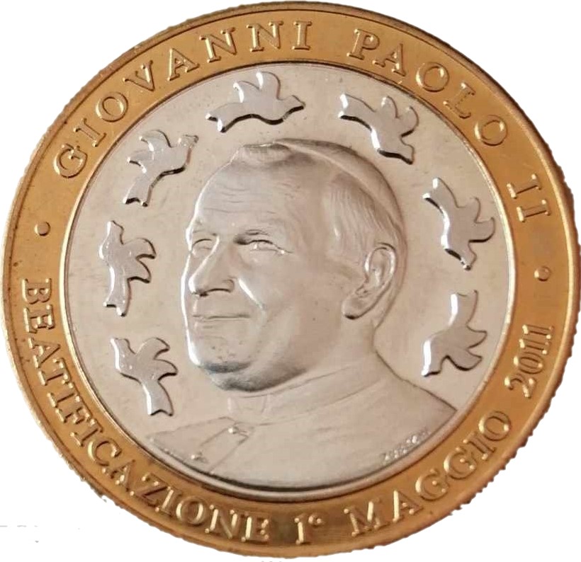 Опис: Центральний, але нахилений бюст Івана Павла II, голуби, що оточують його, напис.