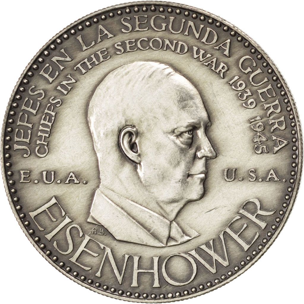 Опис: Праворуч — Дуайт Ейзенхауер, текст іспанською та англійською мовами: назва серії зверху, ім'я особи знизу, країна з боків.