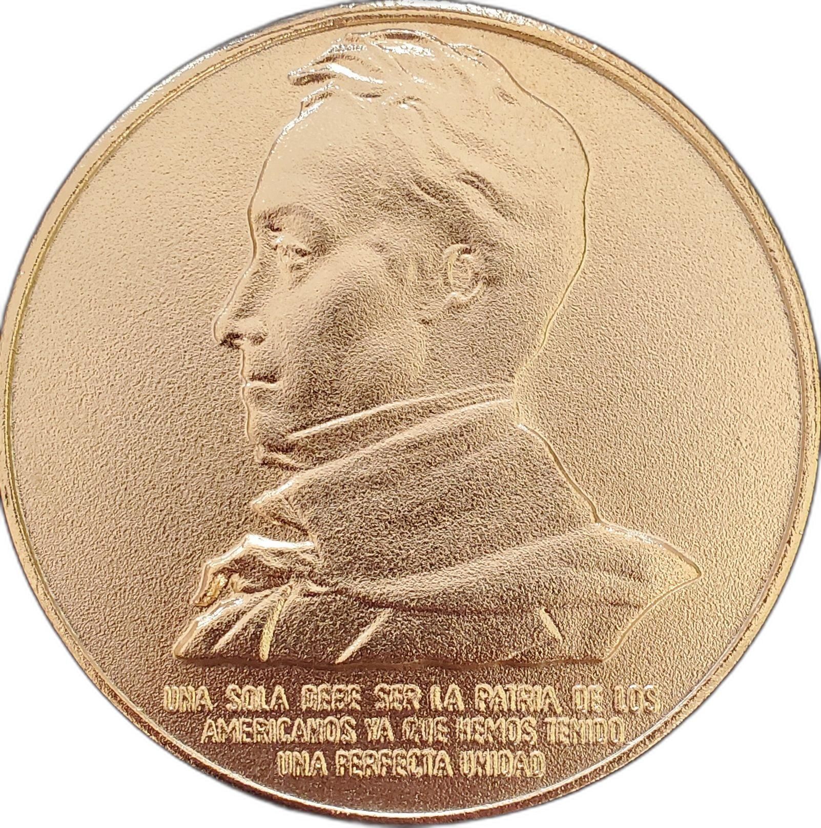 Опис: Профіль Сімона Болівара, звернений ліворуч, над цитатою, яку він надіслав директору Об'єднаних провінцій Хуану Мартіну де Пуейредону в 1818 році.