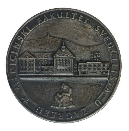 Опис: Вид з півдня на головні будівлі Медичного факультету Загребського університету. Оригінальна будівля в центрі та ліворуч, нова будівля праворуч із трьома важливими для історії Медичного факультету роками: 1669, 1874, 1917. На задньому плані гора Медведниця з видатним вежею «Сльєме» (загребська телевізійна та радіовежа, висотою 169 м). Скульптура Франко Кршиніча «Дівчина з книгою» (Djevojka s knjigom) під будівлями. Напис по краю.