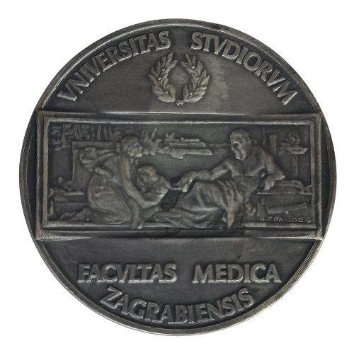 Опис: Зображення мідного рельєфу «MEDICINA» — супрапорт (декорація між верхньою частиною дверей і стелею), виконаний скульптором Робертом Франгешем Міхановичем. Рельєф є алегоричним зображенням медицини і знаходиться в Хорватському інституті історії в Загребі. Лавровий вінок над рельєфом. Напис по краю.